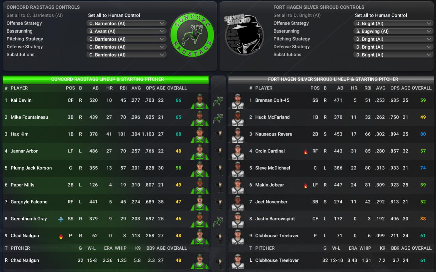I accidentally hit the advance button, so I skipped past Game 1. Since I had not yet saved graphics, I am going to minimalize them to just a Game 2 starting lineups screenshot for this preview. I will change it back in the Association Semifinals Round.