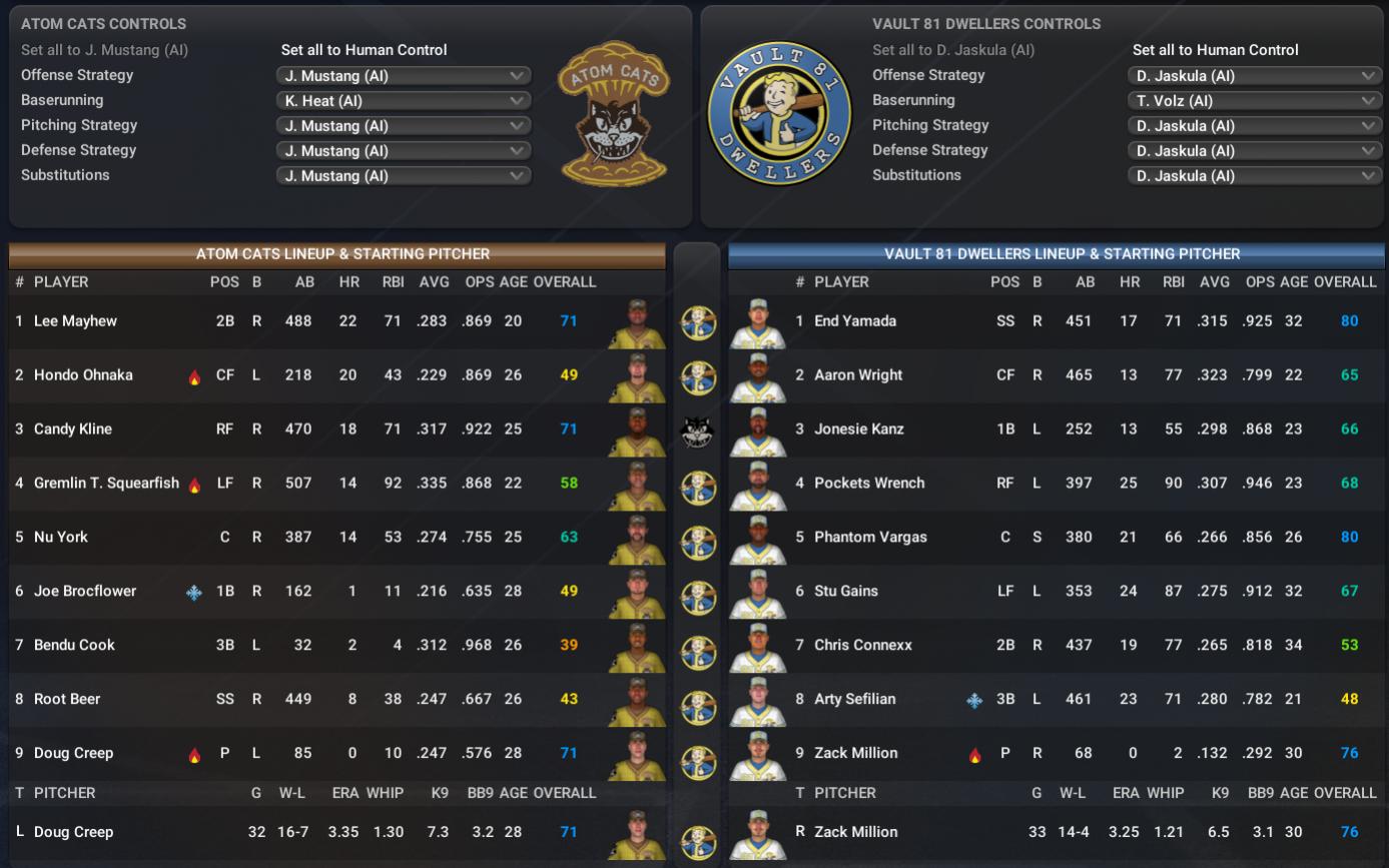 BNN Report News from the CBO, Minors, CCBL, CYL, and CBA by Nat Wright-Kawolski 14 September 2314 Playoffs Preview - Association Championship Series Round #3 Fort Hagen Silver Shroud (74-56) vs #1 The Slog Ghouls (84-46) Season Series: Fort Hagen 3, The Slog 1 June 16-17 @Slog: FtH 5-3, FtH 3-1 August 12-13 @FtH: FtH 7-2, Slog 10-5 Analysis Two seasons ago, the Fort Hagen Silver Shroud won their first championship. One year later, The Slog found itself in the NCA Champions Series, only to fall to Nahant in the battle of wildcard teams. The only playoff matchup between these two teams came in 2312 when the #1 Shroud won three out of five in the Association Semifinal Round over the #5 Ghouls. This season, the Shroud enter as the 3rd seed, while the Ghouls are the top seed in the NCA. For The Slog, they also claim their Sole Survior Series crown in the first season of baseball in the Commonwealth before Commissioner Nate Howard was able to fully unite the four leagues. In that season, the Ghouls were the 7th seed of eight teams, ultimately defeating Finch Farm (now Nahant) in the SSS. While the Ghouls look to be the better team, the one-on-one matchups between the teams favored the Silver Shroud. Nuke Laloosh (2-0, 3.14) was the major pitching hero, but will not be back in 2314 with a shoulder injury suffered in August. Ony Laloosh and Sarthis Idren (1-1, 4.26) started against The Slog. 1B Nick Coulter (.583/2/7) had the most success hitting for Fort Hagen. The Ghouls did not light the bats on fire against three solid pitching outings against them in the season series, but RF Cypher Raige (.400/0/1) and 2B Puddle Norman (.364/1/4) were able to scrap together some hits. Rookie CF Name Brand Brown (.154/1/4) was not highly successful but did tie the stream lead in homers and RBI against the Silver Shroud--he is not part of the playoffs roster, though. On the mound, Isaiah Swindler (0-2, 3.75) pitched decently in his two matchups against Laloosh but could not find the victory. Klement Thodberg (0-1, 4.35) started the other two games. Looking at overall team stats, the Ghouls seem to have the advantage with the top two stats being runs scored and runs allowed. In both categories, The Slog has better numbers, including being 2nd in the NCA in runs (688) and 1st in runs allowed (508), while Fort Hagen was 10th in runs (620) and tied for 3rd in runs allowed (584). Prediction If Laloosh were available, this would be the Shroud's series to take. Unfortunately, the loss of a great pitcher is hard to overcome, especially when the success against the Ghouls came from his dominance. The Slog has built up a solid team of upcoming youngsters and established veterans and look ready to take the NCA this season after disappointment in the NCACS last season. We'll take them. The Slog 4, Fort Hagen 2 #2 Quincy Gunners (75-55) vs #1 Vault 81 Dwellers (95-35) Season Series: Vault 81 4, Quincy 0 May 21-22 @Qui: V81 4-1, V81 6-0 Ju;y 25-26 @V81: V81 6-4, V81 8-1 Analysis We were curious what the Dwellers would do in their opening round after suffering some recent trauma in playoff action. Well, the team that set the CBO record with 95 wins swept the defending CBO champions, Atom, to move on. Now, we are not sure any team is capable of handling this machine. Quincy will most certainly try, though we see them as being happy to get this far after some extensive struggles over the years. In this season of returning to the playoffs after missing the last three seasons, the Gunners also return to the SCACS. In 2310, in just their third-ever playoff appearance, Quincy reached the SCACS as the #2 seed, eventually dropping the series to #4 Oberland. The Gunners also defeated Vault 81 that season in the Association Semifinals Round, winning 3-2. It was the only playoff matchup between the two squads. Now, the Dwellers are out for revenge. That revenge creeped up in the regular season when Vault 81 won all four matchups and held the Gunners to 0, 1, and 1 runs in three of the matchups. Pitching is tough for Vault 81, and Quincy has struggled against good pitching this season. All seems to favor the team from the vault. Looking at statistical standouts for each team in their seasonal matchups, first of all, there is not much to say about Quincy hitting. Team star, 2B Will Hell, (.333/2/4) was the only respectable hitter. LF Desert Dog Smith (.100/0/0) and SS Pipewrench Mathis (.077/0/0) both had a hit apiece with 10+ at-bats. Pitching was not much better with Fosdyke Rochambeau (0-2, 8.10) getting shellacked in two starts. SP Make Money (0-1, 1.80) had a decent outing in his one start but left trailing 1-0 in a game the Gunners dropped 4-1. Vault 81 did not have great batting stats, but a few players thrived in the season series. RF Joe Rathmann (.421/1/2) led the team in average, while 3B Artie Sefilian (.375/2/7) was the power leader. All four starters got a start against the Gunners with Scruffy Taguchi (1-0, 0.00) and Ryan Goodpryce (1-0, 0.00) not giving up a run in their innings pitched. Zack Million (1-0, 5.06) gave up some runs but still came away with the 6-4 victory. Prediction We already hate that we picked a team to sweep in the Association Semifinal Round. It would be insane for us to predict a sweep in the Championship Series Round. Statistically, it seems highly unlikely that a team wins all eight games against another good team. Easy City Downs has a high payout for a sweep, so they have calculated the numbers and agree. The Gunners are only missing starting CF Duff Fee (.224/2/23) who was not doing great when he was injured. Otherwise, both teams are intact. In the end, we have no doubt Vault 81 will be headed to the Sole Survivor Series. Insanity ensues. Vault 81 4, Quincy 0