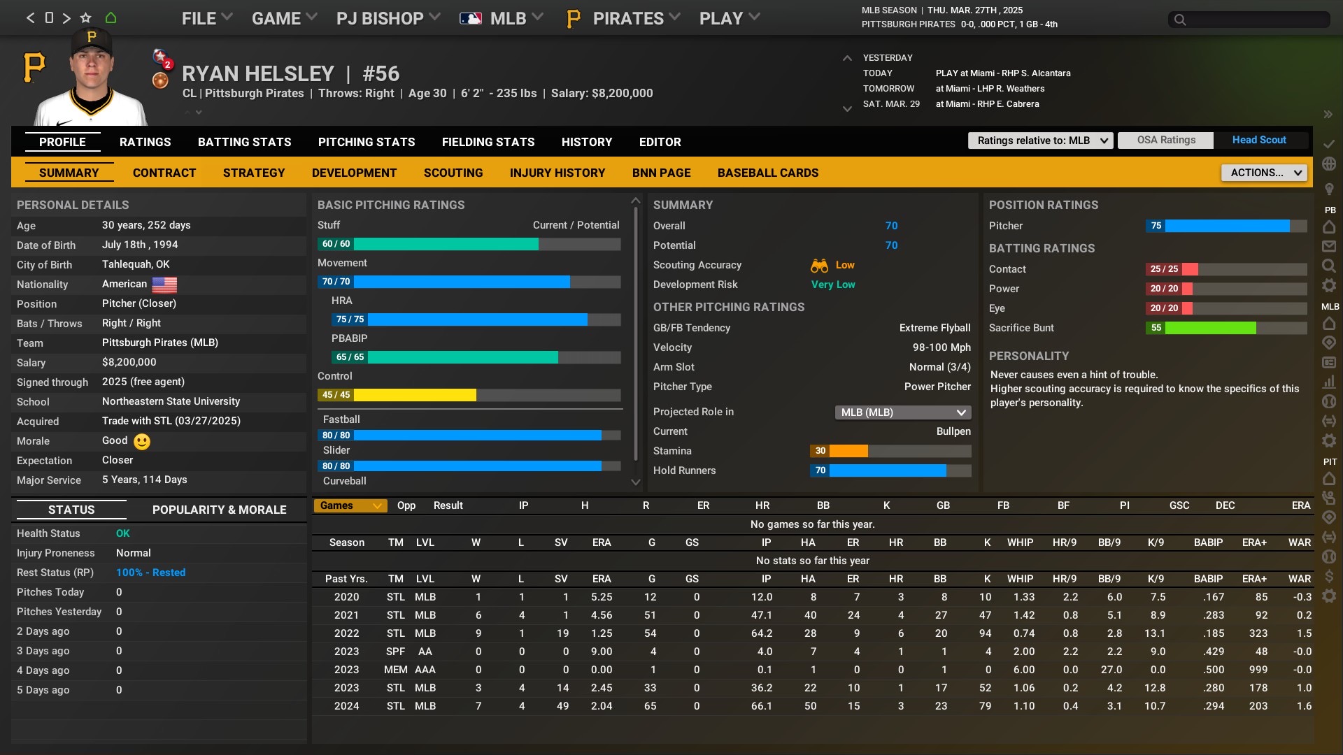 Hello, my name is PJ Bishop and I’ll be taking over the Pittsburgh Pirates as both GM and manager. Coming off 6 straight losing seasons and missing the playoffs for 9 straight seasons we are in the rebuilding phase. Be as that may I am looking to compete right away and make any changes necessary to get the club back in the playoffs soon as possible. I intend on playing out every single game and make most of the decisions for the MLB club. I will micro manage any top prospect but the day to day runnings of the minor leagues will be handled by the assistant GM Ben Cherington.