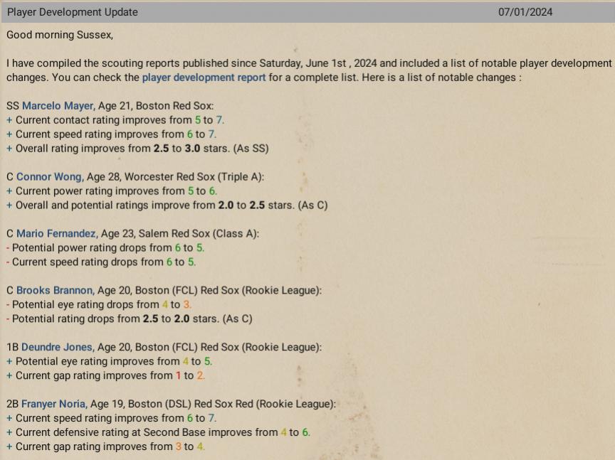 The player development report is out and Marcelo Mayer received a nice bump to his contact and speed ratings. Hate seeing the hit to Mario Fernandez' potential power and current speed ratings, as I was hoping to develop him into major-league bench strength.