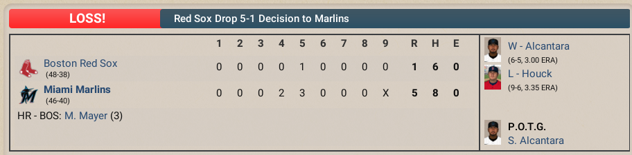 The Miami Marlins (47-40) jumped out to an early lead and cruised to a 5 to 1 victory over the visiting Boston Red Sox (48-39). Disappointing to see the Boston offense dry and up not play well against a solid Miami team.