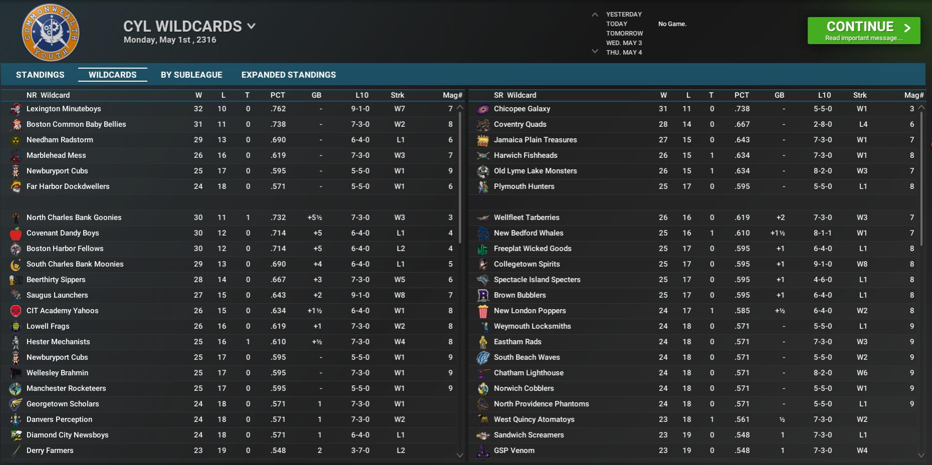 BNN Report News from the CBO, Minors, CCBL, and CYL by Nat Wright-Kawolski 11 May 2316 CYL Regular Season Ends; Lexington, Chicopee #1 Seeds Another Commonwealth Youth League campaign is in the books. The regular season has ended and the playoffs are about to begin. It is a time of skill, talent -- and luck. And when all the games have been played, one team will survive and be crowned the 2316 Youth Series champion. It's playoff time. The best teams have emerged from the divisional battles and now it is the survival of the fittest. Only one team will survive and they will be crowned the Commonwealth Youth League champions. Here are the matchups in the Regional Opening Round: NR #16 Georgetown Scholars vs #1 Lexington Minuteboys #9 North Charles Bank Goonies vs #8 Covenant Dandy Boys #14 Needham Radstorm vs #3 Marblehead Mess #13 Beerthirty Sippers vs #4 Lowell Frags #12 Saugus Launchers vs #5 Newburyport Cubs #11 CIT Academy Yahoos vs #6 South Portland Guns #10 South Charles Bank Moonies vs #7 Boston Harbor Fellows #15 Hester Mechanists vs #2 Boston Common Baby Bellies SR #16 Spectacle Island Specters vs #1 Chicopee Galaxy #9 Wellfleet Tarberries vs #8 Freeplat Wicked Goods #14 Brown Bubblers vs #3 Harwich Fishheads #13 Eastham Rads vs #4 Old Lyme Lake Monsters #12 Collegetown Spirits vs #5 Coventry Quads #11 New Bedford Whales vs #6 Weymouth Locksmiths #10 New London Poppers vs #7 Norwich Cobblers #15 Truro Hatchlings vs #2 Jamaica Plain Treasures