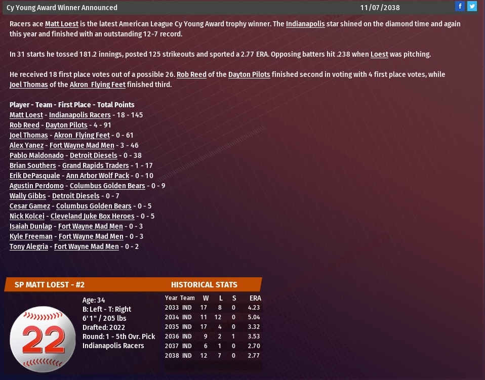 Coke, who also won his first Silver Slugger, batted .344 with 45 homers, 123 RBIs and 112 runs scored in 155 games. His home runs and RBIs led the National League, as did his .640 slugging percentage. The 25-year-old also got on base at a .388 clip. The last St. Louis player to win the NL MVP was Nick Shaw in 2036. Andrew Benintendi, who won the honor in 2019, is the only other River Walker to win the honor. |