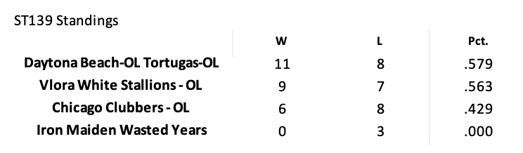 Limited play has produced a tight race in OL St139. Daytona Beach hosts Vlora for a big 4-game series late tonight. The Clubbers maintain a shot at the title, while Iron Maiden is wasting away towards Margaritaville and the Rookie leagues. (Please excuse the mix of musical genres in that) |