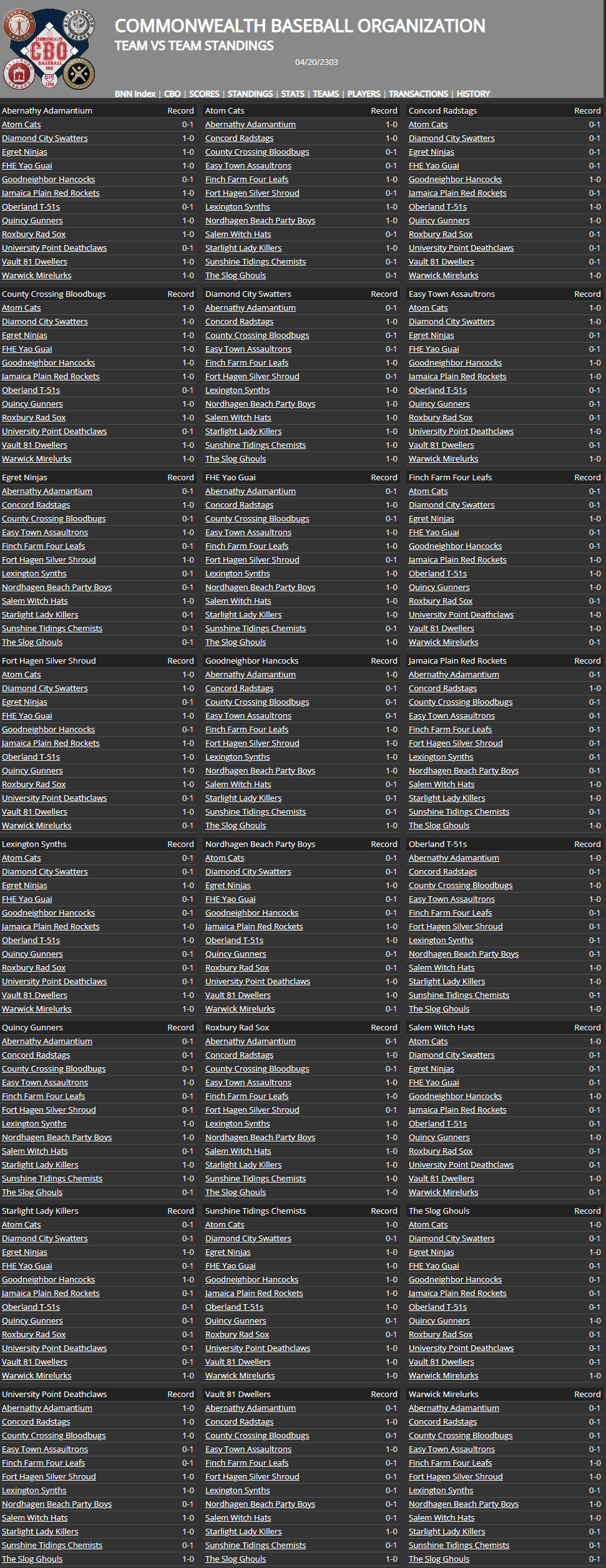 BNN Weekly Report This Week in the CBO, BMU, and GBRL by Nat Wright-Kawolski 4 May 2303 Feature Story: May the Force Be with the Rad Sox When a team drafts at the top of the Rookie Draft year in and year out for several years, they are bound to develop some top-notch prospects. The Roxbury Rad Sox started their venture in the CBO as the bottom team, but they have been building talent and trading for more over the years. Now, they may be the force of the South Charles Association. The lead: 2.45 Runs Allowed/Game Two teams have been absolutely dominant in pitching: County Crossing and the Rad Sox. Both teams are tied for the CBO lead in runs allowed per game, each allowing 54 total runs on the season. Roxbury has had the most highs in that time, leading the CBO in shutouts with five. The Bloodbugs in comparison have had just one. Roxbury has two #1 overall picks at the top of its rotation in Nuka Laloosh (2299) and Eugene Gym (2298). They also once had the rights to the 2296 1st overall pick, Nordhagen Beach's Beachboy Nut but traded him for their current starting left side of their infield in SS Purple Gupta and 3B Donn Mattingley, each of whom are contributing to the Sox's success. Laloosh has been as rock-solid as one can hope for in helping the Rad Sox to the best Starters ERA (1.87), FIP (3.08), and Pitching WAR (5.7) in the SCA. In five starts, Laloosh is 3-0 with a 1.91 ERA in 37.2 innings. He has allowed 29 hits, eight earned runs, and four home runs, walked five batters, and struck out 37. As of today, he leads the CBO in strikeouts per walk at 7.4, 0.4 points better than Nut. He is also one of just 12 pitchers in the CBO, which also includes his teammate Gwinnett Southie, whom we will cover shortly. In the SCA, he is 6th in ERA, tied for 7th in wins, third in pitcher WAR (1.4), tied for 2nd in complete games, tied for 2nd in shutouts, second in strikeouts, third in strikeouts per 9 innings, 2nd in walks per 9 innings, 2nd in WHIP, 3rd in FIP, 6th in ERA+, 5th in rWAR, and tied for 7th in quality starts. Other than the other pitchers in the rotation for Roxbury, he is high on the Vim! Pitcher Award list after four weeks of CBO play. Gym has not been as strong to start the season, though there is nothing wrong with his numbers. In six starts, Gym is 4-2 with a 3.12 ERA. He has pitched 43.1 innings, allowing 41 hits, 15 earned runs, and four homers, walked 12, and struck out 39. The person who has been the dominant factor this season, and BNN's current choice as the runaway Vim! Pitcher Award winner is fourth starter Southie. The former 6th-round pick in the 2296 Inaugural Draft by the Starlight Lady Killers and currently with his fourth different franchise (also, Concord and The Slog), Southie is performing beyond his ceiling, despite having a good career. In his career, he is 74-59 with a 4.44 ERA, including five straight seasons of winning at least 11 games. This season, he is 4-0 in five starts with a 0.54 ERA, allowing just two earned runs in 33.1 innings pitched. He has allowed 21 hits, walked four, and struck out 20 in that stretch. Southie leads the CBO in multiple statistical categories: ERA, WAR (1.6), WHIP (0.75), FIP (1.78), and ERA+ (793), and he is tied for winning percentage. In the SCA, he is the leader or near the top in wins, K/BB (2nd at 5.0), BB/9 (1st at 1.1), rWAR (2nd at 2.1), BABIP (6th at .212), Opp Avg (2nd at .178), and quality starts (1st-T at 5). Finally, third starter, Whokill Poole, a former free agent pickup who made his way into the Roxbury starting rotation last season, has been contributing to the dominance. In six starts, Poole is 4-2 with a 1.61 ERA. He has pitched 44.2 innings, allowing 29 hits, eight earned runs, and three home runs. He has walked 13 and struck out 20. He also is on top of a few CBO categories: complete games and shutouts (2) and rWAR (2.3). He also leads the SCA in innings pitched and is tied for 1st with four wins and five quality starts. News and Notes: Two recent players of the week, including this week's top player in the NCA are on the mend. The Bugs' Babs Rooth (1st in CBO with a .429 average) and Vault 81's Knud Bather are both sitting out a while with injuries. . . . Goodneighbor's former star turned pedestrian player, Bryan Assman, has been finding some success in his power game this season, currently tied for 3rd in the SCA with 8 home runs. Analysis They may have shown a dominant start in going 10-2 against the SCA in the first-ever interassociation matchups in the CBO, but County Crossing (#1) has doubled down against the Institute League, going 9-1 in the opening stretch. Concord (#12) has been the only team the Bloodbugs have not faced, and only Lexington (#16) split a series 1-1 with them. At #2, the team we featured above, the Rad Sox have gone 8-2 in their matchups against the Minutemen League, winning their first five before splitting at Goodneighbor (#7) and Warwick (#21). The defending champions, University Point, is at #3. The Deathclaws have gone 7-3 against a strong Railroad League group, splitting series with Vault 81 (#14), FHE, and Diamond City. The Claws and Rad Sox have yet to face off but meet up in Roxbury tomorrow and Wednesday. Two more Railroad League teams make up #4 and #5 in the Power Rankings. Diamond City went 6-4, which included a three-game losing streak and now a three-game winning streak. The split with the Hancocks, swept Quincy (#17), got swept at Jamaica Plain (#13), split with the Claws, and then swept Atom (#18). For the Yao Guai, they also went 6-4 against the ML. They split with the Gunners, Red Rockets, Claws, and Cats before sweeping Warwick (#21). Oberland started the season decently in interassociation games, going 6-6, but has faded in their matchups against the RL, falling to #24. The T-51s went 1-9 the last two weeks, including a current seven-game winning streak. Their sole victory in that stretch was a 11-8 win over the Mirelurks. Standings Team vs Team Power Rankings 