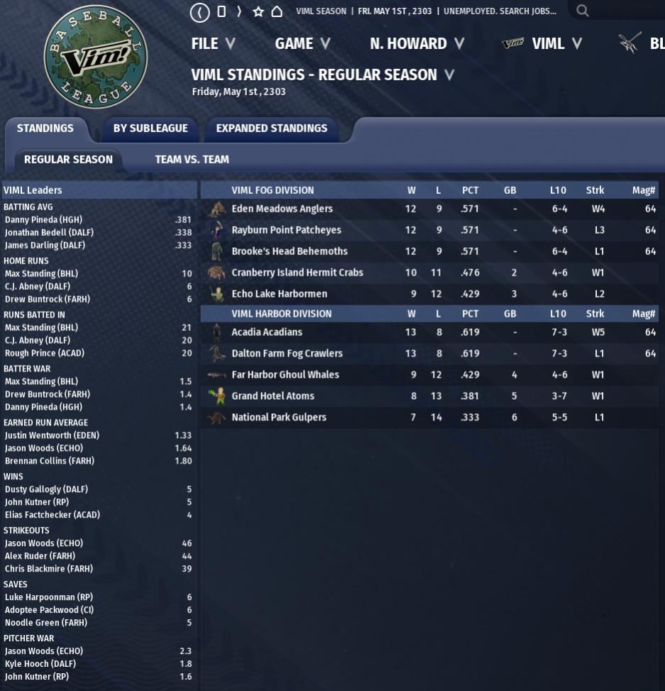 Nuka News Update Reporting on the NWL, NWLB, and APYL Leagues by Evan Guy 1 May 2303 Cherry Tops to End April They have struggled the past two season after winning the Nuka Series in 2300, but the Cherry Ghoulrillas are again sitting on top of the Nuka Word League. With a 7-2 start, the Ghoulrillas have burst ahead of the Dark Bloodworms and stand three games ahead of defending champions, the Victory Cave Crickets. The main reason behind the success is a stellar start on offense. 3B Andy Knickson, a second-year player, has been insane. Knickson is hitting .455 in the first nine games with two home runs and seven RBI. After Knickson, three other players have begun the season batting over .300 and having multiple home runs: RF Bryan Madsen (.343/3/8), 1B Carlos Aguilar (.346/3/6), and SS Mike Blackheart (.310/2/7). While 3.39 as a Starters ERA is not bad, the Ghoulrillas are only third in the league. It is only that high because of SP Khalil Brite's (0-1, 10.80) bad start. Other than Brite, Joe Penaltybox (2-0, 1.09), Mike Coombaya (1-0, 3.75), and Travis Armstrong (2-0, 2.81) are doing just fine. Standings Top Players NWL - RF Sam Noob, Victory - 11/24 (.458), 3 HR, 6 RBI APL - 1B Clap Homestead, Dry Rock Gulch Convicts (Dark) - 12/22 (.545), 2 HR, 7 RBI BBL: Player Highlight RF Justin Starcore, Starport Nuka Hubologists, Jr Star player of the Hubologists. Last season, he hit .320 with 17 home runs and 40 RBI. He hit 20 home runs the year before, which makes him the all-time home run king entering his third season. Starcore is a future 1st-round draft pick in the Season Pass Association draft as one of the best prospects to come out of the Bradberton area. Vim! View Veracious, Vivacious, Vainglorious Vision of the Vim! Leagues by Vikky Vail 5 Teams Can Claim Division Lead in April Five teams currently are tied for their division lead with the other five Vim! League teams needing to step it up. In the Fog Division, three teams have fought their way into the league lead. The Eden Meadows Anglers have been the hottest of those three, winning their last four. The reason the Anglers have been able to tie is because the Rayburn Point Patcheyes have lost three straight. The Brooke's Head Behemoths round out the division. In the Harbor Division, the Acadia Acadians have won five straight to tie the Dalton Farm Fog Crawlers. The bottom three all trail by at least four games. Standings Players of the Month VL Hitter - 2B Max Standing, Brooke's Head - .307, 10 HR, 21 RBI, 15 R, 6 BB, .351 OBP VL Pitcher + Rookie - SP John Kutner, Rayburn Point - 5-0, 2.13, 42.1 IP, 37 K, 18 BB MDIL Hitter - 1B Jason Griffith, Cliff's Edge (Rayburn Point) - .579, 3 HR, 9 RBI, 6 R MDIL Pitcher - SP Nate Johnson, Glowing Grove (BHL) - 3-0, 0.72, 25 IP, 17 H, 10 K, 8 BB Player Spotlight: MYL SS Harter Kalonia, Diamond Cove Fort Knights - Kalonia is in his second year. He played in 40 games and started 38 in his first year. He batted .279 with 5 home runs and 12 RBI. He is considered a leader and a great prospect for a future Season Pass Association draft.