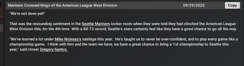 With an 8-2 win over the Los Angeles Dodgers, the Seattle Mariners have clinched the championship of the American League West Division.