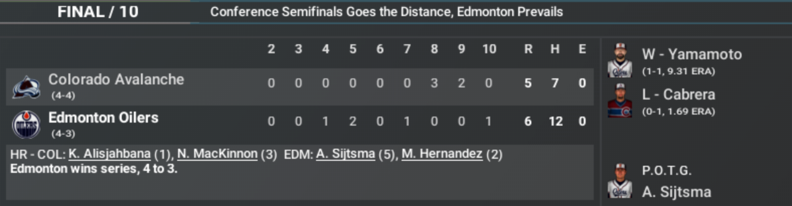 With the sun long set behind the Rockies and 51,561 fans bundled up against a light, misting rain, the Edmonton Oilers took the field at Ball Arena knowing exactly what had to be done. Down three games to two in the series, it was win… or go home. And tonight, they played like a team that planned to keep the lights on a little longer. Shuhei Kunda, the left-hander, was simply marvelous. Seven innings. Four hits. One earned run. A steady heartbeat on a night that demanded it. “You could almost hear the rain tapping his cap brim between pitches,” Vin would muse. “And all he did was keep making Colorado tap the ball softly.” The Oilers struck first, and they struck loud. In the top of the first, a leadoff double, a triple into right-center, and before the Avalanche faithful could even settle in, the score was already 3–1. Then came the second inning. A one-out, hanging sinker from Alexis Castaneda… and Adrie Sijtsma sent it soaring into the night. A two-run homer. “Oh, and you could just tell as soon as he hit it. He didn’t run. He admired. A moment like that, in October… you earn it.” It was 5–1, and the tone was set. Colorado, to their credit, never quit. Nathan MacKinnon tripled early and homered in the ninth to keep the Avalanche within shouting distance. And J. Sanchez — what a series he’s having — crushed his eighth home run in the eighth inning, trimming the deficit. But every time Colorado got close, Edmonton found a way to lean back on its pitching. Romo held the line, Yamamoto — with a touch of drama — sealed it. “If you’ve ever seen a heart skip a beat, you saw it there with two outs in the ninth,” Vin might say softly as MacKinnon’s drive sailed deep… and died at the track. “And the Oilers’ season lives to see another night.” A final score of 6–4. Ten hits to seven. One team forcing a Game 7. One team heading north with hope. Player of the Game: Shuhei Kunda — calm, precise, and brilliant when it mattered most. Next Stop: Rogers Place. Tuesday night. A winner-take-all Game 7. *“And as they say,” Vin would smile, pausing just long enough for the crowd noise to swell, “there’s nothing quite like October… when everything comes down to one game.” |