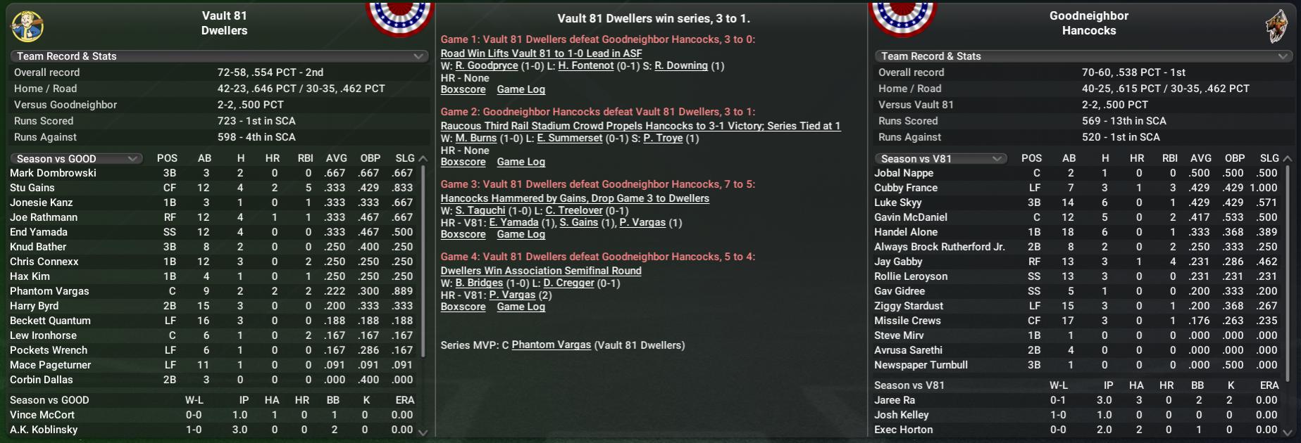 BNN Report News from the CBO, Minors, CCBL, and CYL by Nat Wright-Kawolski 21 September 2312 CBO Championship Series Results NCA #3 Salem Witch Hats vs #1 Fort Hagen Silver Shroud Game 1: Fort Hagen 6, Salem 3 Colt-45, Fort Hagen Open ACS Strong with 6-3 Win The Fort Hagen Silver Shroud started the Association Championship Series in style, downing the visiting Salem Witch Hats at Hubris Comics Park by a score of 6-3 to grab an early 1-0 lead in the best-of-7 series. Silver Shroud shortstop Brennan Colt-45 went 3-4 with a home run and 2 singles. He scored 3 times. Sleve McDichael hit a 2-run double off Pokey Chatman in the bottom of the first, which put the Silver Shroud in front, 2-0. In addition to the double, McDichael had 1 single, while going 2 for 4. "Postseason wins taste oh so sweet," said Colt-45 after the game. The next game is set to be played tomorrow at Hubris Comics Park in Fort Hagen. Game 2: Fort Hagen 7, Salem 4 Blitzed by Revere, Silver Shroud, Witch Hats Sink Further in ACS The Fort Hagen Silver Shroud defeated the Salem Witch Hats, 7-4, in Game 2 of the Association Championship Series. A big contributor was second baseman Nauseous Revere, who was 1 for 1 with a home run and 3 walks, while scoring 2 runs. The win moves Fort Hagen into a 2-0 lead in the series. Sleve McDichael had a key at-bat with one out in the bottom of the third for Fort Hagen. With the bases loaded and the Silver Shroud leading 1-0, he hit a sacrifice fly. "Solid performance from our side," said Silver Shroud manager Darnell Bright. The next game is set to be played for Wednesday, September 18th , 2312 at Vim! Park of Salem in Salem. Game 3: Salem 5, Fort Hagen 2 DeLong Blasts Silver Shroud, Witch Hats Take Game 3, 5-2 The Salem Witch Hats have closed some of the gap between themselves and the series-leading Fort Hagen Silver Shroud, winning, 5-2, at Vim! Park of Salem. Witch Hats first baseman Brian DeLong was 2-4 with a home run. He scored 2 runs and drove in 3. The win cuts the deficit facing the Witch Hats to 2-1 in the best-of-7 Association Championship Series. DeLong had a consequential at-bat in the bottom of the third for the Witch Hats. Coming up with a runner on 1st and Salem trailing 1-0, he hit a 2-run home run. "We were a little off-kilter to start the series, but we're getting things figured out now," Salem manager Nick Caudill told reporters. "At least I hope we are." The next game is set to be played tomorrow at Vim! Park of Salem in Salem. Game 4: Fort Hagen 3, Salem 2 Almost There: Fort Hagen On Cusp of ACS Triumph After 3-2 Win The Fort Hagen Silver Shroud moved to within one game of the Sole Survivor Series, downing the Salem Witch Hats on the road at Vim! Park of Salem by a score of 3-2. Silver Shroud left-hander La'Ray Kalel had a strong outing. He threw 5.1 innings of 1-hit ball. The win gives the Silver Shroud a 3-1 advantage in the best-of-7 Association Championship Series. Fort Hagen used the hitting of Hid Matsumoto to pick up the win. The center fielder clubbed a solo home run in the top of the seventh inning to put the Silver Shroud on top, 3-2. For the game, Matsumoto had 1 home run and 1 single in 4 at-bats. Matsumoto called the win "a team effort." The next game is set to be played tomorrow at Vim! Park of Salem in Salem. Game 5: Fort Hagen 8, Salem 6 Silver Shroud Move on to Sole Survivor Series The Fort Hagen Silver Shroud triumphed 8-6 over the Salem Witch Hats at Vim! Park of Salem in the Association Championship Series to capture it 4-1. Orcin Cardinal led the charge, going 2 for 4 with a home run, a walk, a run, and five RBI. The victory advanced the Silver Shroud to the Sole Survivor Series. For his superb play in the series, Silver Shroud center fielder Hid Matsumoto garnered the series MVP trophy, hitting .250, scoring 7 runs and batting in 6. "Only thing better than getting MVP for winning in the playoffs would be winning MVP for winning in the Sole Survivor Series," Matsumoto said later. "I'll get to work on that." The Fort Hagen Silver Shroud will play against the Vault 81 Dwellers in the next round. Vault 81 won their series against the Jamaica Plain Red Rockets 4 games to 0. The Sole Survivor Series schedule will be announced after the Association Championship Series finishes. SCA #5 Jamaica Plain Red Rockets vs #3 Vault 81 Dwellers Game 1: Vault 81 4, Jamaica Plain 3, 10 inn. Summerset, Dwellers Take Dramatic Game 1 for 1-0 Series Lead The Vault 81 Dwellers took the first game of the Association Championship Series in dramatic fashion, topping the Jamaica Plain Red Rockets, 4-3, in an extra-inning walk-off win. Dwellers right-hander Exxie Summerset threw 6.1 innings allowing 3 runs. The clutch at-bat came in the bottom of the 11th inning, when Vault 81 right fielder Pockets Wrench, facing Herbie Popnecker, had a run-scoring sacrifice fly. It gave the Dwellers the 4-3 win. "This game tested our mettle," said Wrench. The next game is set to be played tomorrow at CURIE Inc. Field in Boston. Game 2: Vault 81 9, Jamaica Plain 6 Vault 81 Pins 9-6 Loss on Jamaica Plain Riding the 2-hit performance of shortstop End Yamada, the Vault 81 Dwellers stopped the visiting Jamaica Plain Red Rockets, 9-6, in Game 2 of the Association Championship Series. Yamada was 2 for 3 with 2 singles and 2 walks. He scored 2 times and drove in 2 for the Dwellers, who now lead the best-of-7 series, 2 games to 0. In the bottom of the third, Vault 81 center fielder Stu Gains had a productive at-bat. With the bases loaded and no one out, Gains stroked a 2-run single to center. It made the score 2-0, Vault 81. For the game, he was 1 for 3 with 2 walks. He drove in 2 runs and scored once. "We'll keep riding this wave," said Gains. The next game is set to be played for Thursday, September 19th , 2312 at Red Rockets Stadium in Jamaica Plain. Game 3: Vault 81 6, Jamaica Plain 4, 12 inn. Road Win Lifts Vault 81 to 3-0 Lead in ACS With second baseman Harry Byrd leading the charge, the Vault 81