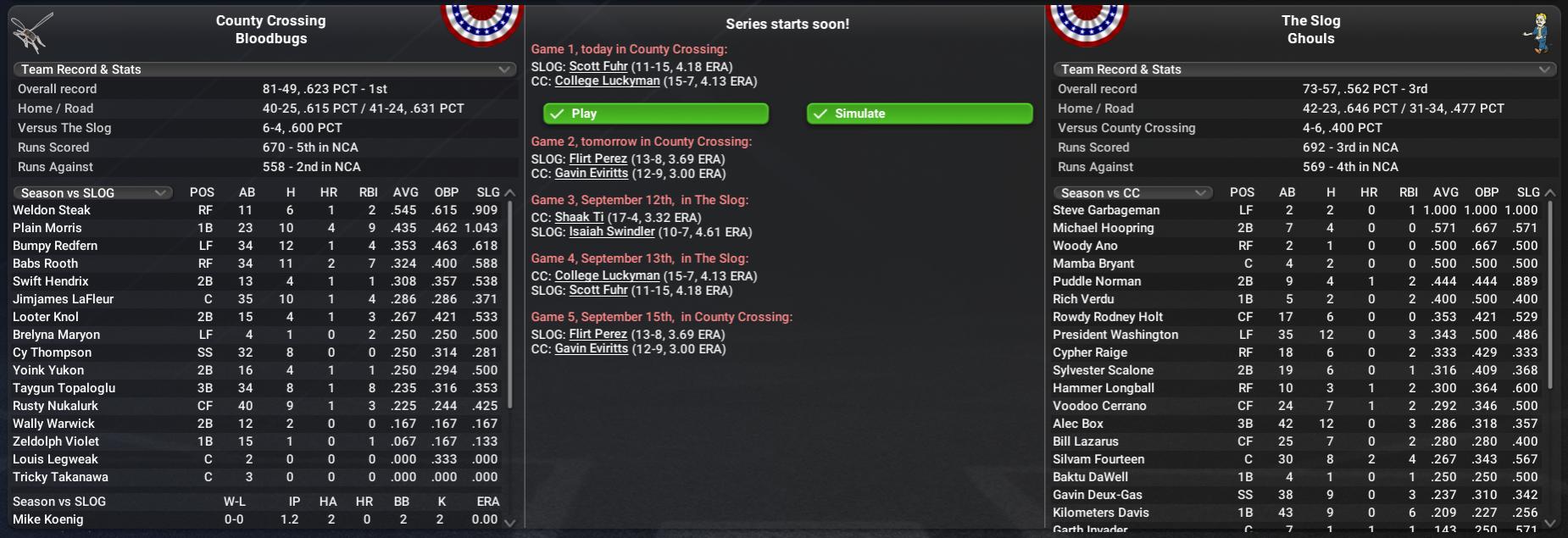 As far as the Radscorpions are concerned, I was pulling for them, too, as the ultimate Cinderella story. Oh well, maybe next year. They should be happy with how well they are developing players. I may need to make a deep dive into their front office to see what's up. They most certainly have not benefited from my interference.