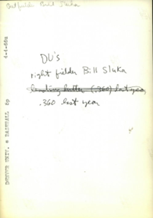 Bill Sluka was briefly an outfielder in the Red chain in 1967 playing in the Northern and Appalachian leagues. This is Bill Sluka as a right fielder for the University of Denver Pioneers in a photo dated 1964, I have included the back of the photo which gives his position and batting average for that year. Sluka was drafted in the 71st Rd of the '67 draft.