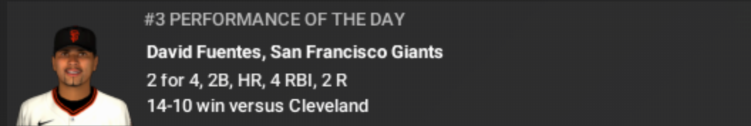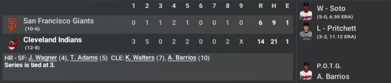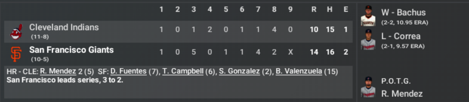 “Well… folks, here we go again. Game 5 at Oracle Park, Giants 14, Indians 10. Cleveland scored ten runs, hit the long ball, but it wasn’t enough. The Giants now lead the series 3-2. And for Cleveland, this has got to hurt—three games in a row on the West Coast, and the Indians lose them all.” “Reynaldo Mendez with two home runs, five RBIs—he was phenomenal tonight—but the Giants offense? Just relentless. Every time Cleveland tried to rally, San Francisco answered. This series is a war.” Chris “Mad Dog” Russo (Giants fan, ecstatic): “War? Harry, this was a battleground and the Giants came out on top. Ten runs from Cleveland, fourteen from us! And do you know who made it happen? Bill Valenzuela, Joey Fields, David Fuentes—everybody contributing! That three-run homer by Valenzuela in the third? Game changer. BOOM! Giants take the lead and never looked back.” Doyle: “Cleveland’s offense was hardly silent. Hollander with four hits, Mendez clobbered two homers, Walters and Holloway driving in runs… they hung in there. But when your pitching staff gives up seven runs to start? Against a team hitting like the Giants tonight? That’s a tall order.” Russo: “Tall order? That’s an understatement. The Indians tried, sure—but San Francisco refused to let them dictate the pace. Campbell, Dick, Perdomo, Valenzuela, Fuentes… they all had at least a hit, and Fields chipped in as well. This isn’t luck, this is Giants baseball in October.” Doyle: “And don’t forget, this was a long, exhausting game—3 hours and 18 minutes of back-and-forth slugging. The Indians never quit, but they’ve now lost three straight in San Francisco. Heading back to Cleveland, Game 6 is suddenly a must-win to stay alive.” Russo: “Exactly. And Harry, let me be clear: the momentum is swinging HARD to the Giants. Three straight wins at home, they lead the series 3-2. Cleveland will have a loud crowd Thursday, sure, but the Giants know how to score in bunches. Game 6? Oh, it’s going to be fireworks. Buckle up, everyone.” Doyle (sighing, half-admiringly): “Fireworks indeed. This is a World Series no one predicted. One thing is certain: Cleveland can’t afford to make another mistake. Otherwise, San Francisco is just a win away from the championship.” Russo (smirking): “And we like it that way, Harry. We like it that way.” ⚾ |