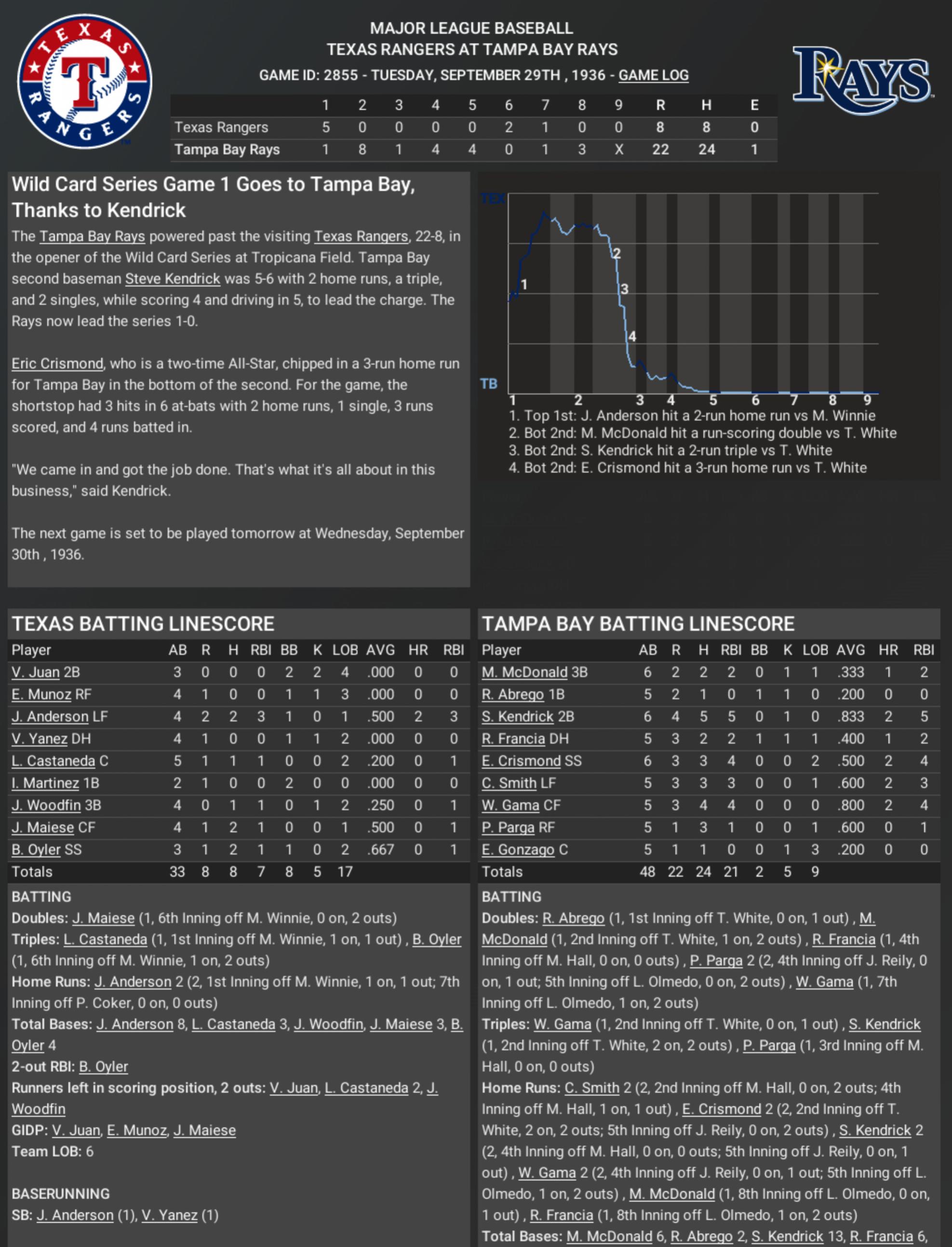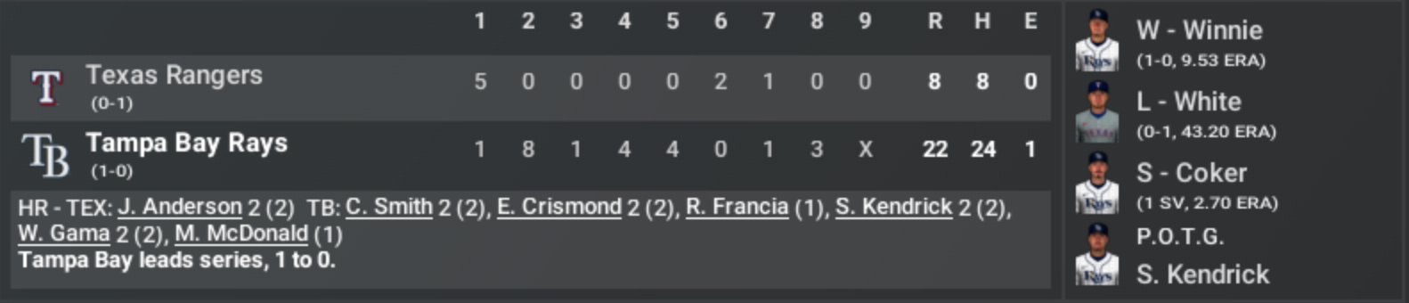 So let me get this straight. Texas scores FIVE runs in the first inning… …and still loses by fourteen. That tells you everything about Tampa Bay — and everything about Texas. This game was over before it was competitive, and then it became something else entirely: a message. Let’s start big picture, because that’s what I do. Tampa Bay hit TEN home runs. TEN. In a playoff game. That’s not variance. That’s not luck. That’s who they are. This is the fourth straight year Tampa Bay has been a real October team, and what do real October teams do? They don’t panic. They absorb punches, and then they counter with a sledgehammer. Texas lands the first punch — boom, 5–0 — and Tampa responds with EIGHT runs in the second inning like, “Cute. Now sit down.” And the star of the show? Steve Kendrick. Five-for-six. Two homers. A triple. Five RBIs. Four runs scored. That’s not a hot night. That’s a career-defining playoff performance. You know how I always say: great teams have players who turn moments into resumes? That’s Kendrick. This game is going to live on his baseball card forever. And it wasn’t just Kendrick. That’s the scary part. Crismond: two homers, four RBIs Gama: two homers, four RBIs C. Smith: two homers Everyone ate This was a team flex. Tampa didn’t just beat Texas — they embarrassed the entire concept of pitching depth. Texas used five pitchers and none of them survived. One of them had a Game Score of ONE. That’s not playoff baseball, that’s batting practice with consequences. Now let’s talk about Texas, because somebody has to. This is the danger of being a good-but-not-great team. You win 88 games, you feel validated, and then you walk into a stadium with a real contender and realize you’re playing a different sport. Texas isn’t bad. They’re just not built for this. Their pitching staff cracked immediately, and once it cracked, it shattered. This wasn’t nerves. This was exposure. And here’s the takeaway — the thing people will talk about tomorrow: Tampa Bay didn’t even pitch well. Their starter gave up seven runs and they still won by fourteen. Why? Because elite offenses erase mistakes. Good teams need everything to go right. Great teams don’t. That’s why Tampa keeps showing up in October. That’s why Anaheim and Cleveland are waiting. And that’s why Texas is already in trouble. Game 1 goes to Tampa Bay. But more importantly? The psychological edge is gone. Texas knows it now. And Tampa made sure everyone else did too. This series didn’t start. It got claimed. 💣⚾️ |