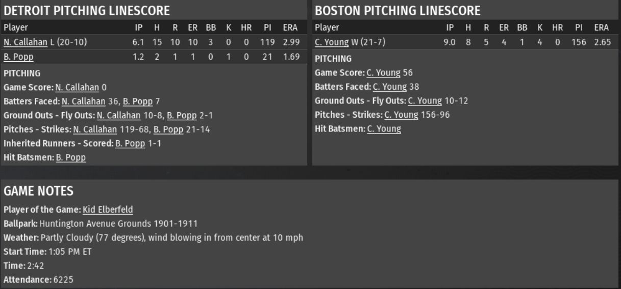 Young (21-7) allowed 5 runs (4 earned) on 8 hits, 1 walk, and 1 hit batsman; Game Score of 56. Tigers pitcher Nixey Callahan (20-10) lasted 6 1/3 innings in which he allowed 10 earned runs on 15 hits and 3 walks; Game Score of 0. Reliever Bill Popp covered the final 1 2/3 innings, allowing 1 earned run on 2 hits and 1 hit batsman. With 17 hits (6 of which went for extra-bases), there were several Boston American batters who warrant mention, including Kid Elberfeld (2 for 3, Triple, 2 Runs, 2 RBIs, 1 Walk), Bill Lange (2 for 5, Double, 1 Run, 3 Stolen Bases), Dave Brain (3 for 5, 2 Runs, 2 Stolen Bases), and Frank Chance (2 for 3, 1 Run, 1 RBI, 1 Walk, 1 Stolen Base). For the Tigers, Dave Fultz (2 for 5, 1 Run, 1 Stolen Base) and Tom Daly (2 for 4) saw the ball well today. Player of the Game: Kid Elberfeld (Season: #3 / Career: #6)