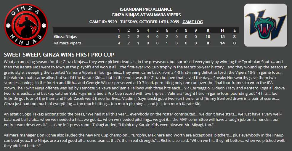 I'm tired and weak, but ready to pick up the IPA Pro Cup Finals... looks like the wonderful darlings of the Islands just might win their very first Pro Cup trophy. But then again, what a series it would be if Valmara started hitting the ball they way they can... the Vipers could get back into it. But Ginza has Kurt Brophy... I think he will wrap up the Pro Cup Series, should he get another start.. Last edited by Eugene Church; 04-07-2019 at 11:17 PM. |