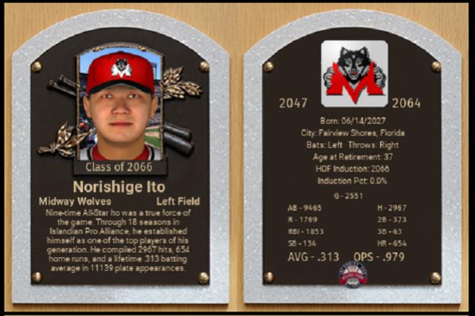 Monday, November 2, 2066 HALLOWED IPA HALL OF FAME ADDS TWO NEW LEGENDS: ITO AND BUISSON There are now 107 members of the Islandian Pro Alliance Hall of Fame... the lastest additions are Norishige Ito and Lenny Buisson, two of the most outstanding players of the past two decades... Ito starred for the Arroyo Grande Suns and the Midway Wolves from 2047 to 2064 and Buisson excelled for the Belle Plaine Musketeers and the Taranto Tars from 2046 to 2064... Ito and Buisson are the newest members in the IPA Hall of Fame class of 2066. Norishige Ito had a marvelous 18-year-career in the IPA from 2047 to 2064 in the Tycobbian Union, playing with Arroyo Grande for his first 7 seasons and his last 11 with Midway... he was a 5-time Tycobbian Most Valuable Player ('52, '54, '55, '57, '61)... 9-time All-Star... 6-time Gold Bat ('52, '53, '54, '55, '57, '61)... 3-time Gold Glove... Ito was a star outfielder that sparked the Midway Wolves to the dynastic level... from '53 to '61 the Wolves won 6 pennants and two Pro Cups... they almost won three straight Pro Cups... in '55 they reached the TU Finals, but lost to IPA champion White River... Ito hit .313 lifetime with 654 homers (9th IPA all-time), 1853 RBIs (13th IPA all-time) and scored 1769 runs... he retired in 2064 at age 36... still a good hitter, Ito batted .300 that year with 26 home runs and 70 RBIs... he decided to retire before his playing talents fell off to a level that might be embarrassing to him... Ito also did well in the playoffs, batting .321 in 48 games with 10 homers, 39 RBI and 28 runs. Right fielder Lenny Buisson is one of the most prolific powerhitter in IPA history... he wound up third in home runs with 734 all-time... only Jerry Culpepper of Bayview (878 HR) and Jack Elliott of High Mesa (848 HR) finished ahead of him... Buisson drove in 1875 runs, 12th-best in IPA history, and scored 1613 runs, while batting .301 in his 19 seasons (2046-2064), playing his first 8 years in Belle Plaine and his final 11 in Taranto in the Ruthlandian Union... Buisson won his only RU Most Valuable Player trophy in 2048... he was a 4-time Golden Bat winner ('48, '52, '53, '57)... 6-time All-Star... Golden Glove winner... and was chosen the Ruthlandian Union Rookie of the Year in 2047... Buisson got to the postseason twice and excelled both times with a .348 BA in 22 games with 10 homers and 17 RBIs... the Tars advanced to the RU Finals both years in 2054 and 2056...they were defeated by IPA Pro Cup champion Wynnamac in '56... Buisson went out in style with 34 roundtrippers and 95 RBIs his last season at age 38 with a .276 BA. Last edited by Eugene Church; 01-07-2021 at 10:21 PM. |