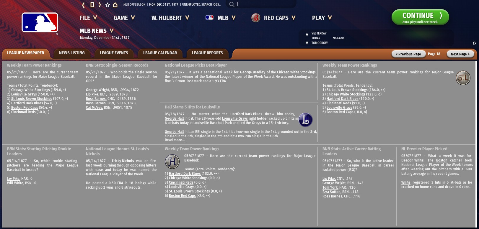 1877 NATIONAL LEAGUE LEAGUE STANDINGS Team W L WPct GB R RA Cincinnati Reds 35 23 .603 - 298 228 Chicago White Stockings 35 25 .583 1 339 259 Hartford Dark Blues 31 29 .517 5 330 340 Boston Red Caps 31 30 .508 5½ 367 324 St. Louis Brown Stockings 29 31 .483 7 300 284 Louisville Grays 19 42 .311 17½ 287 486 LEAGUE BATTING STATS Team R/G R G AB H 2B 3B HR BB SO SB AVG OBP SLG OPS Boston Red Caps 6.0 367 61 2339 652 61 52 2 77 134 110 .279 .305 .352 .657 Chicago White Stockings 5.7 339 60 2254 657 61 44 1 45 101 66 .291 .312 .359 .671 Hartford Dark Blues 5.5 330 60 2263 603 76 37 2 41 121 99 .266 .282 .335 .618 St. Louis Brown Stockings 5.0 300 60 2252 601 56 41 2 58 169 81 .267 .289 .331 .620 Cincinnati Reds 5.1 298 58 2130 553 59 30 4 41 102 76 .260 .279 .321 .600 Louisville Grays 4.7 287 61 2282 586 64 40 1 24 152 87 .257 .272 .321 .593 LEAGUE PITCHING STATS Team R/G R G CG SHO SV ERA IP HA HRA BB K WHIP OAVG BABIP Cincinnati Reds 3.9 228 58 47 6 0 2.10 510.0 547 1 29 120 1.13 .258 .272 Chicago White Stockings 4.3 259 60 47 3 0 2.29 526.1 554 1 30 155 1.11 .252 .270 St. Louis Brown Stockings 4.7 284 60 53 2 1 2.14 534.2 520 3 46 129 1.06 .236 .248 Boston Red Caps 5.3 324 61 50 2 0 2.67 545.1 644 4 27 173 1.23 .274 .292 Hartford Dark Blues 5.7 340 60 50 2 0 2.79 526.1 618 1 38 98 1.25 .273 .283 Louisville Grays 8.0 486 61 27 2 2 5.09 528.1 769 2 116 104 1.68 .323 .335 Babe Ruth MVP Award Ross Barnes CHC .331/.372/.461, 254 AB, 4 SB, 143 wRC+, 3.0 WAR Cy Young Award George Bradley CHC 26-18, 2.42 ERA, 375.0 IP, 1.11 WHIP, 2.9 K/9, 7.6 WAR Jackie Robinson Award Bobby Mitchell CN1 7-5, 1.86 ERA, 96.2 IP, 1.25 WHIP, 4.1 K/9, 2.1 WAR Gold Glove Award Pitcher Bobby Mathews CN1 .958 PCT., 6 PO, 17 A, 1.54 RANGE Catcher Cal McVey CHC .936 PCT., 141 PO, 48 A, 37.8 CS % First Base Al Spalding CHC .952 PCT., 515 PO, 23 A, 9.53 RANGE Second Base George Wright BSN .888 PCT., 169 PO, 165 A, 5.51 RANGE Third Base Amos Booth CN1 .834 PCT., 17 PO, 109 A, 2.83 RANGE Shortstop Jack Manning CN1 .905 PCT., 83 PO, 193 A, 5.40 RANGE Left Field Paul Hines CHC .877 PCT., 120 PO, 1 A, 2.92 RANGE Center Field Lip Pike CN1 .952 PCT., 268 PO, 10 A, 5.04 RANGE Right Field Bob Addy CN1 .920 PCT., 176 PO, 7 A, 3.24 RANGE Silver Slugger Award Pitcher George Bradley CHC .239/.254/.290, 0 HR, 8 RBI, -0.3 WAR Catcher Cal McVey CHC .301/.318/.385, 0 HR, 29 RBI, 1.9 WAR First Base John Morrill BSN .312/.338/.357, 1 HR, 38 RBI, 1.1 WAR Second Base Ross Barnes CHC .331/.372/.461, 0 HR, 32 RBI, 3.0 WAR Third Base Cap Anson CHC .315/.344/.393, 0 HR, 28 RBI, 1.9 WAR Shortstop John Peters CHC .303/.312/.358, 0 HR, 22 RBI, 1.2 WAR Left Field Paul Hines CHC .323/.346/.400, 1 HR, 31 RBI, 1.8 WAR Center Field Jim O'Rourke BSN .295/.329/.403, 1 HR, 35 RBI, 1.4 WAR Right Field Tim Murnane BSN .296/.318/.340, 0 HR, 34 RBI, 0.2 WAR LEAGUE ALL-STARS League Batting Leaderboards Batting AVG On-Base PCT Slugging PCT On-Base + Slugging wRC+ WAR B. Ferguson HAR 3.5 R. Barnes CHC 3.0 J. Clapp SL3 2.7 M. McGeary SL3 2.7 G. Wright BSN 2.3 Runs Created / 27 outs Isolated Power Games L. Brown BSN 61 B. Crowley LS1 61 J. Gerhardt LS1 61 G. Hall LS1 61 J. Latham LS1 61 At-Bats J. Gerhardt LS1 281 A. Leonard BSN 281 J. Burdock HAR 278 M. McGeary SL3 278 J. Peters CHC 274 Runs C. Anson CHC 50 J. O'Rourke BSN 50 A. Leonard BSN 49 M. McGeary SL3 49 J. Morrill BSN 49 Hits M. McGeary SL3 99 G. Hall LS1 94 J. Clapp SL3 89 J. Gerhardt LS1 88 B. Ferguson HAR 87 Total Bases G. Hall LS1 139 B. Ferguson HAR 121 J. Gerhardt LS1 119 R. Barnes CHC 117 J. Clapp SL3 113 Singles M. McGeary SL3 92 J. Morrill BSN 77 J. Peters CHC 74 J. Clapp SL3 72 A. Leonard BSN 71 Doubles G. Hall LS1 18 L. Brown BSN 16 J. Manning CN1 16 J. Remsen SL3 16 T. York HAR 15 Triples E. Sutton BSN 14 R. Barnes CHC 12 G. Hall LS1 12 J. Gerhardt LS1 11 B. Ferguson HAR 10 Home Runs D. Force SL3 2 A. Booth CN1 1 B. Ferguson HAR 1 G. Hall LS1 1 P. Hines CHC 1 Runs Batted In L. Brown BSN 48 G. Hall LS1 47 M. Dorgan SL3 39 J. Morrill BSN 38 J. Battin SL3 37 Stolen Bases J. Morrill BSN 19 J. O'Rourke BSN 19 L. Brown BSN 18 B. Harbridge HAR 18 T. Carey HAR 16 Bases On Balls G. Wright BSN 19 R. Barnes CHC 16 J. O'Rourke BSN 13 B. Addy CN1 12 B. Harbridge HAR 11 Intentional Walks G. Wright BSN 11 J. Remsen SL3 5 R. Barnes CHC 4 D. Force SL3 3 L. Lee SL3 3 Hit-By-Pitch P. Hines CHC 6 B. Craver LS1 5 L. Brown BSN 4 H. Dehlman SL3 4 G. Hall LS1 4 Strikeouts L. Brown BSN 37 H. Dehlman SL3 34 T. Bond BSN 26 T. Larkin HAR 24 G. Bradley CHC 23 Sacrifice Hits G. Bradley CHC 18 T. Bond BSN 15 T. Nichols SL3 15 F. Lafferty LS1 12 J. Blong SL3 6 Sacrifice Flies R. Barnes CHC 4 J. Battin SL3 3 J. Cassidy HAR 3 G. Hall LS1 3 L. Pike CN1 3 League Pitching Leaderboards ERA C. Cummings CN1 1.62 B. Mitchell CN1 1.86 T. Nichols SL3 2.09 J. Blong SL3 2.23 G. Bradley CHC 2.42 Wins T. Larkin HAR 31 T. Bond BSN 28 G. Bradley CHC 26 T. Nichols SL3 19 C. Cummings CN1 13 Losses T. Bond BSN 28 T. Larkin HAR 25 T. Nichols SL3 22 F. Lafferty LS1 20 G. Bradley CHC 18 Winning PCT C. Cummings CN1 .722 G. Bradley CHC .591 B. Mitchell CN1 .583 T. Larkin HAR .554 J. Blong SL3 .526 Saves J. Blong SL3 1 J. Haldeman LS1 1 F. Lafferty LS1 1 D. Allison HAR 0 J. Bass HAR 0 Games Pitched T. Bond BSN 58 T. Larkin HAR 58 F. Lafferty LS1 51 G. Bradley CHC 47 T. Nichols SL3 42 Games Started T. Bond BSN 57 T. Larkin HAR 56 G. Bradley CHC 44 T. Nichols SL3 39 F. Lafferty LS1 26 Complete Games T. Larkin HAR 48 T. Bond BSN 47 G. Bradley CHC 35 T. Nichols SL3 35 J. Blong SL3 18 Shutouts C. Cummings CN1 3 T. Bond BSN 2 G. Bradley CHC 2 F. Lafferty LS1 2 T. Larkin HAR 2 Innings Pitched T. Bond BSN 492.1 T. Larkin HAR 487.2 G. Bradley CHC 375.0 T. Nichols SL3 345.0 F. Lafferty LS1 266.2 Hits Allowed T. Bond BSN 587 T. Larkin HAR 560 F. Lafferty LS1 416 G. Bradley CHC 396 T. Nichols SL3 350 Home Runs Allowed T. Bond BSN 4 T. Nichols SL3 3 F. Lafferty LS1 2 G. Bradley CHC 1 T. Larkin HAR 1 Walks Allowed B. Craver LS1 52 F. Lafferty LS1 31 T. Larkin HAR 31 T