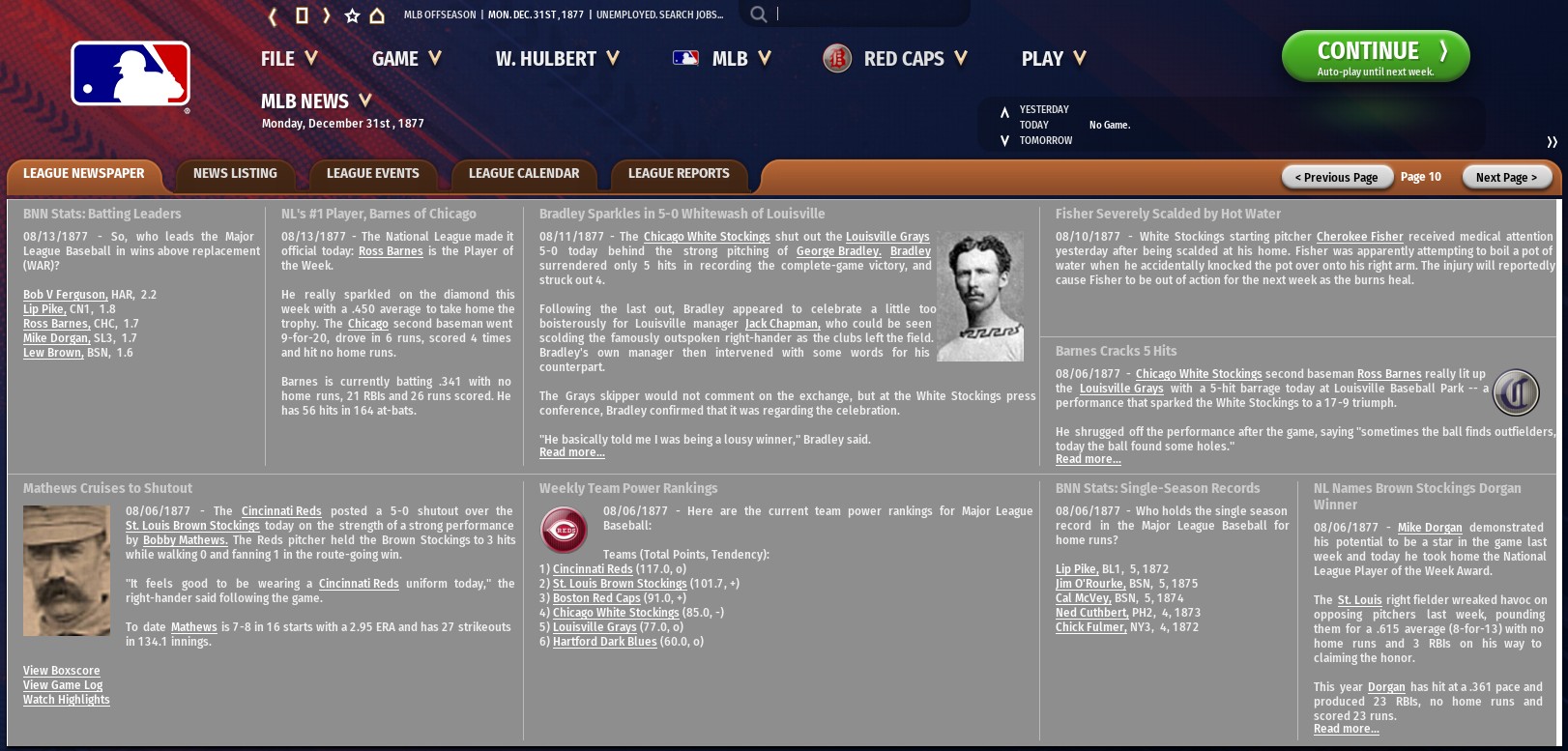 National LEAGUE BASEBALL World Championship Series CINCINNATI REDS AT CHICAGO WHITE STOCKINGS GAME 5- SUNDAY, OCTOBER 14TH , 1877 - GAME LOG 1 2 3 4 5 6 7 8 9 R H E Cincinnati Reds 0 0 0 0 0 0 0 0 0 0 6 3 Chicago White Stockings 0 0 0 1 0 1 2 0 X 4 9 0 Chicago White Stockings Capture World Championship Series The Chicago White Stockings are champions, today and forever. The White Stockings topped the Cincinnati Reds 4-0 at 23rd Street Grounds today to claim the World Championship Series crown. "Nobody can take this away from us, not ever," said series MVP and left fielder John W Glenn after his club had sealed the victory. "We worked hard and we accomplished our goal." The atmosphere was electric as the newly-crowned champs stormed the field at the conclusion of the game. Fans cheered, gloves flew in the air, high fives and hugs were the order of the day. "From day one of spring training, I could see it in their eyes," said Chicago manager Al Spalding. "The players had that look of intensity, of hunger, of a desire to accomplish something great, and today they did that. They're champions of the world." The White Stockings took the series 4-1. CINCINNATI BATTING LINESCORE CHICAGO BATTING LINESCORE Player AB R H RBI BB K LOB AVG HR RBI J. Manning SS 4 0 1 0 0 0 3 .200 0 1 B. Addy RF 4 0 1 0 0 1 2 .091 0 0 L. Meyerle 3B 4 0 1 0 0 0 2 .364 0 4 C. Jones 1B 4 0 0 0 0 1 3 .200 1 3 L. Pike CF 4 0 0 0 0 0 1 .143 0 3 H. Kessler C 3 0 1 0 0 1 0 .235 0 0 A. Booth P 3 0 1 0 0 0 0 .176 0 0 N. Cuthbert LF 3 0 0 0 0 0 2 .000 0 0 H. Smith 2B 3 0 1 0 0 0 2 .333 0 0 Totals 32 0 6 0 0 3 15 BATTING Total Bases: J. Manning , B. Addy , L. Meyerle , H. Kessler , A. Booth , H. Smith Runners left in scoring position, 2 outs: J. Manning , C. Jones Team LOB: 5 BASERUNNING CS: L. Meyerle (3) FIELDING Errors: L. Meyerle , L. Pike , N. Cuthbert PB: H. Kessler 2 Player AB R H RBI BB K LOB AVG HR RBI J. Peters SS 4 1 1 0 0 0 0 .280 0 5 J. Hallinan RF 3 0 1 1 1 0 0 .375 0 2 R. Barnes 2B 4 2 2 0 0 0 2 .381 0 4 C. McVey C 4 0 2 1 0 0 2 .409 0 3 C. Anson 3B 4 0 2 1 0 0 1 .273 0 4 A. Spalding 1B 4 0 0 0 0 0 4 .190 0 1 J. Glenn LF 4 0 0 0 0 0 4 .571 0 3 D. Eggler CF 4 1 1 0 0 0 4 .318 0 3 G. Bradley P 3 0 0 0 0 0 0 .167 0 1 Totals 34 4 9 3 1 0 17 BATTING Doubles: C. McVey (1, 6th Inning off A. Booth, 1 on, 0 outs) Triples: R. Barnes (2, 6th Inning off A. Booth, 0 on, 0 outs) Total Bases: J. Peters , J. Hallinan , R. Barnes 4 , C. McVey 3 , C. Anson 2 , D. Eggler Runners left in scoring position, 2 outs: , C. McVey 2 , J. Glenn , D. Eggler 2 Team LOB: 7 FIELDING PB: C. McVey CINCINNATI PITCHING LINESCORE CHICAGO PITCHING LINESCORE Player IP H R ER BB K HR PI ERA A. Booth L (0-1) 8.0 9 4 2 1 0 0 112 2.25 PITCHING Game Score: A. Booth 51 Batters Faced: A. Booth 35 Ground Outs - Fly Outs: A. Booth 11-13 Pitches - Strikes: A. Booth 112-75 Player IP H R ER BB K HR PI ERA G. Bradley W (2-0) 9.0 6 0 0 0 3 0 123 1.00 PITCHING Game Score: G. Bradley 78 Batters Faced: G. Bradley 32 Ground Outs - Fly Outs: G. Bradley 10-13 Pitches - Strikes: G. Bradley 123-82 GAME NOTES Player of the Game: George Bradley Ballpark: 23rd Street Grounds Weather: Partly Cloudy (50 degrees), wind blowing in from right at 9 mph Start Time: 2:05 PM CT Time: 2:24 Attendance: 2856 |
