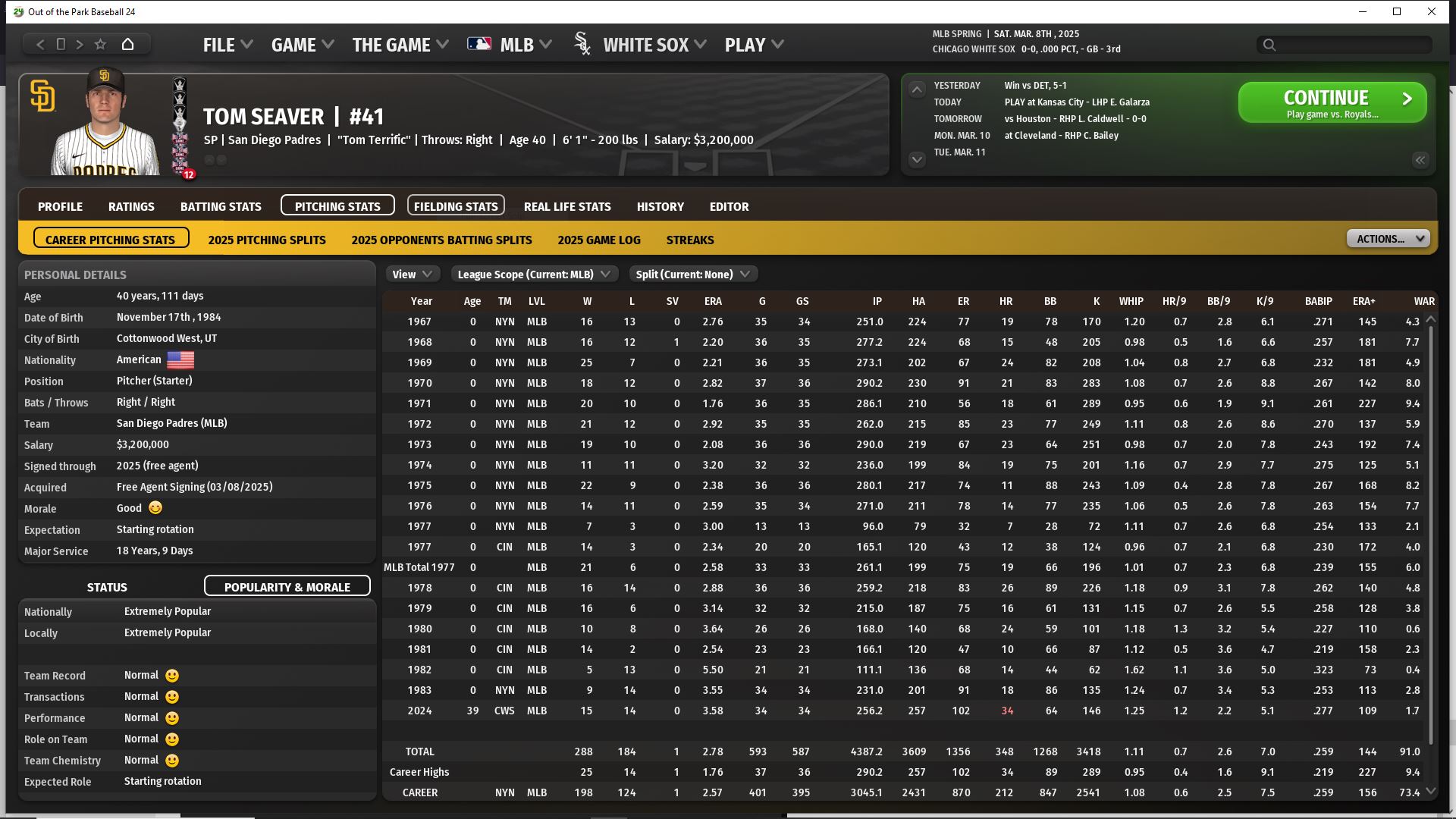 Although we faded at the end, we had a good season overall. We went 1-2 in the playoffs. Many things to look forward to in 2025, although some changes need to be made. I am looking at bringing in a top prospect 1b, a veteran DH, 2 relief pitchers, 1 from each side and a few top prospects. No upcoming FA's will return in 2025.