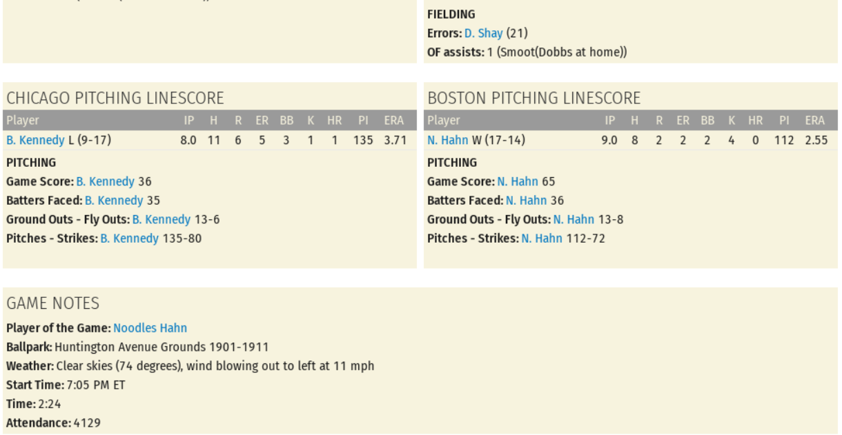 Hahn (17-14) earned the victory by keeping Chicago in check, allowing 2 earned runs on 8 hits and 2 walks while striking out 4; Game Score 65. Brickyard Kennedy was tagged with the loss after 6 runs (5 earned) on 11 hits and 3 walks; Game Score 36. There was a nice distribution of offense from the Americans, as Jiggs Donahue (2 for 4, Homerun, 2 Runs, RBI, Stolen Base), Danny Shay (1 for 3, Double, 3 Runs, RBI, Walk, Stolen Base), and Noodles Hahn (2 for 3, Double, RBI) hit the ball well. The Chicago hitting-attack was primarily from John Dobbs (2 for 3, Walk) and Harry Bay (2 for 4). Player of the Game: Noodles Hahn (Season: #16 / Career: #61)