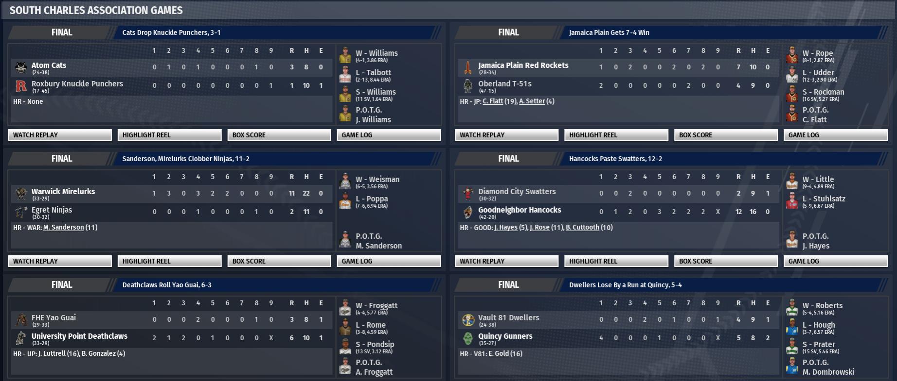 Today in the CBO News and Notes - Reports from around the Commonwealth by Nat Wright-Kawolski 2 July 2298 - Ghouls Rough Up Four Leafs, 11-2, Move into 2nd The The Slog Ghouls beat the Finch Farm Four Leafs, 11-2, at Finch Family Park. Boots Yellowhair, in particular, was impressive. He went 2 for 2 with 2 home runs and 2 walks. He drove in 4 runs and scored twice. The Slog now has a record of 35-29 with the win. The Slog used the bat of Kyle Whale to get the win. The left fielder hammered a 3-run home run in the top of the first inning to put the Ghouls ahead, 5-0. It was his lone hit in 5 at-bats, but it did its damage. "Things went our way," said Yellowhair. The Ghouls' C.T. Woodard led all players in hits. He was 4 for 4 with four runs scored and an RBI. 2 July 2298 - Beebe Excels in 7-1 Starlight Win The Starlight Lady Killers defeated the Abernathy Adamantium, 7-1, at Valentine Detective Agency Field today. Leading the charge for Starlight was right fielder Damani Beebe. He went 4 for 4 with a home run and 3 singles, while scoring 2 runs and driving in 2. The win for the Lady Killers raised their record to 35-29, placing them just one game back of the Adamantium for first place in the Institute League. Jesus Church hit a 2-run home run off Kyle Clevinger in the bottom of the first, which put the Lady Killers ahead, 2-0. In addition to the homer, Church had 1 single and 1 double, while going 3 for 5. "It was a tough night at the plate," said Abernathy manager Chase Stingwing. 2 July 2298 - Hancocks Stick Gunners with 9-6 Loss The Goodneighbor Hancocks downed the Quincy Gunners, 9-6, at Third Rail Stadium at S. Boston HS. The Hancocks were led by Good Don Duck. He went 4 for 5 with a triple, a double, and 2 singles. He scored 3 times. Quincy Eloquent got the win, improving to 10-5. He pitched 6 innings, giving up 7 hits and 3 runs, while striking out 5 and walking 3. Goodneighbor is now 44-20, 9 games up in the South Charles Association Minutemen League. Goodneighbor took the lead in the bottom of the sixth. With one out and runners on 1st and 3rd, Burtie Cuttooth stroked a run-scoring single to make it 4-3, Hancocks. "We'll pop the top on a cold beverage and get back to work tomorrow," Duck said. 2 July 2298 - Lacy Helps Diamond City Cruise to 11-0 Win The Diamond City Swatters had no problem beating the Roxbury Knuckle Punchers, 11-0, at Atomatoys Stadium at Roxbury. Wayne Lacy led the way and continued his CBO MVP push. He was 3 for 4 with a home run, a double, and was hit by a pitch. He scored 3 runs and drove in 2 for Diamond City. X10-44 Mannson got credit for the win, improving to 9-4. He allowed no runs on 4 hits in 6.1 innings. The Swatters bumped their record to 32-32 with this win. Who knows how it might've ended, had it not been for Prince Billingsley? The Diamond City left fielder had a 2-run single in the top of the first inning to put the Swatters on top, 3-0. For the game, Billingsley had 2 doubles and 1 single in 5 at-bats. "We'll relax tonight and get back after it tomorrow," Lacy said after the game. 2 July 2298 - Masterson Hits 2 Home Runs in Party Boys Win Spirited fans greeted the Easy Town Assaultrons for their clash with the Nordhagen Beach Party Boys. The Nordhagen Beach Party Boys downed the Easy Town Assaultrons, 8-2, at Easy Town Field. Brian Masterson led the way, going 3-for-3 for Nordhagen Beach. Nordhagen Beach improves to 39-25 with the win. They lead their division by 4 games. Michael Fogcrawler, the top prospect, had a direct impact on the outcome. Fogcrawler contributed a 2-run home run in the top of the third inning to put Nordhagen Beach up, 4-0. It was his 21st of the season, putting him one behind teammate Dustin Mart for the NCA lead. "You work hard, day in and day out, hoping to give the fans something to cheer about. Today was a good day," Fogcrawler told the Nordhagen Beach News.