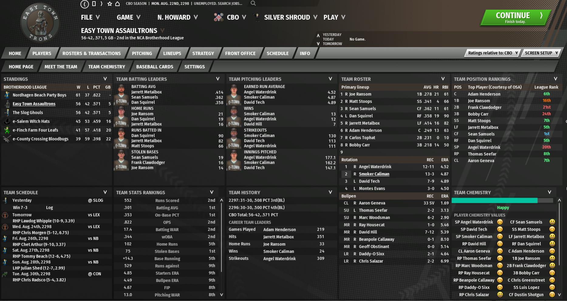 Today in the CBO News and Notes - Reports from around the Commonwealth by Nat Wright-Kawolski 18 August 2298 - BMU: Big Leaguers Clinch GSL with Win The Eastlake Aquaboys went down to defeat to Burp Taylor and his Natick Banks teammates. The final score was 4-2 in favor of the Big Leaguers. Natick Banks has 3 straight wins, Eastlake 3 straight losses. Natick Banks used the clutch hitting of Tesla Petersen to capture the win. The second baseman drilled a bases-clearing double in the top of the sixth inning to give the Big Leaguers the lead, 4-1. For the game, Petersen had 2 singles and 1 double in 4 at-bats. "I just trusted my stuff," said Taylor (13-3). The manager of the Natick Banks Big Leaguers, Scott Vetson, said "a lot of hard work, talent and luck" are the reasons for his team's Massachusetts Association Glowing Sea League championship. "This club believes in themselves and goes out and gets it done," said Vetson. "You can't ask for much more than that as a manager." It's the club's 1st Glowing Sea League crown and gives them an opportunity to win the franchise's 1st Boston Minor Series. "We want that title badly," said starting pitcher Burp Taylor as he took a break from celebrating with teammates. "This is just a start." 18 August 2298 - BMU: Reliford, Action Boys Get 5-0 Win Postal Square rode a fine outing from starter Josh Reliford to victory over the Boston Common Lead Bellies at Shamrock Taphouse Stadium of the Square. The final score was 5-0. Postal Square is now riding a 3-game win streak. Reliford made it look effortless. He scattered 4 hits over 7.1 innings, while racking up 11 strikeouts. The Postal Square right-hander encountered little resistance from the Boston Common hitters. His season record is now 4-0. "Feels good to get the job done," Reliford said after the game. 18 August 2298 - BMU: Churchman Excels, Taffington Boathouse Blows Out Galleria Taffington Boathouse first baseman Lou Churchman made his presence felt in the 13-3 Spy Hunters triumph over the Galleria Robotics Experts. Churchman went 3 for 4 with a home run, 2 singles, and a walk, while scoring 3 times and driving in 4. Taffington Boathouse, at 32-37, holds down 4th place in the Commonwealth Association Dark Hollow Pond League. With Taffington Boathouse leading 1-0 in the top of the first, Churchman hit a 2-run single off Galleria hurler Chad Stewburger. It was the 16th hit of the season for Churchman and put his team ahead, 3-0. "We were able to get some things going offensively," said Churchman. Lannie Tykeson was the victorious pitcher, moving his record to 4-7 on the season. 18 August 2298 - BMU: Coats, Snipers Wallop Rayguns, 12-1 The Trinity Plaza Snipers buried the Cabot House Rayguns, 12-1, under a barrage of hits. Jonathan Coats led the onslaught, going 3-for-5 for Trinity Plaza. Trinity Plaza now has a record of 40-29 with the win. With Trinity Plaza leading 2-0 in the bottom of the first, Coats hit a fastball from Joe Osborne for a 3-run home run. It was his 2nd home run of the season and put the Snipers ahead, 5-0. "If we play like this, we can win a lot of games," Coats told the Trinity Plaza Times. Josh Dude (2-0) was the winning pitcher, allowing just one earned run on four hits with a walk and 14 strikeouts in the complete game victory. His 14 strikeouts tied the Massachusetts Association record.