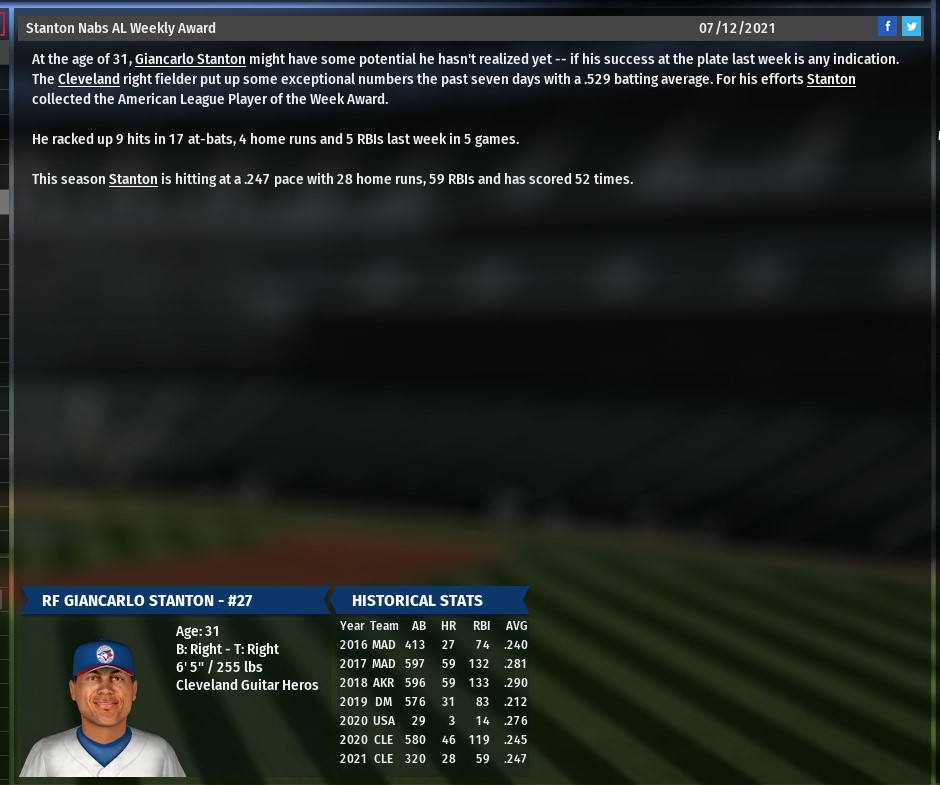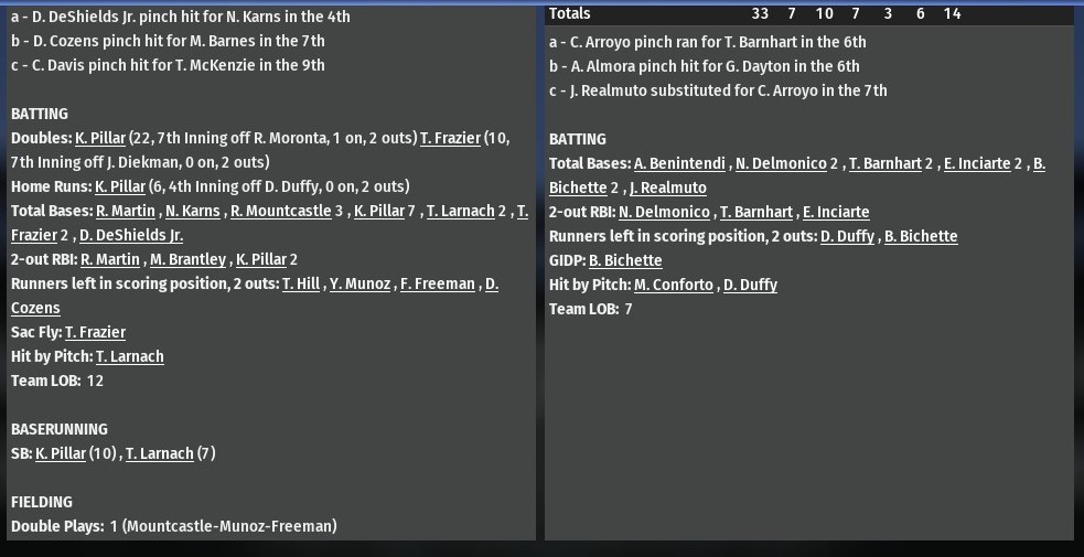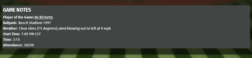 Brandon Lowe's three-run home run off St. Louis starting pitcher Yu Darvish capped a four-run top of the fifth inning which helped carry Green Bay to a 6-5 win at Busch Stadium (1997). Tied 2-2, Alek Thomas led off with a single and moved to second on a wild pitch while Darvish was retiring the next two batters. However, Anthony Rendon drew a walk. A throwing error on a pick-off attempt at first by catcher J.T. Realmuto allowed Thomas to score, putting the Long Haulers in front 3-2. Chance Sisco then drew a walk, bringing Lowe to the plate. He smacked the third pitch he saw from Darvish 355 feet into the left-field seats, making it 6-2. After holding Green Bay scoreless over the first three innings, Darvish gave up six over the fourth and fifth. In the fourth, Miguel Cabrera had led off the inning with a homer. Sisco later singled and scored on a Bobby Gulden single, putting the Haulers ahead 2-1. St. Louis tied it in the bottom of the fourth on Bo Bichette's RBI single off reliever Robert Gsellman. The River Walkers would eventually slice the deficit down to a run. An Adeiny Hechavarria two-run double highlighted a three-run seventh as St. Louis pulled to within 6-5. However, the Walkers would not score again despite leaving the bases loaded in that inning and again in the eighth, when they didn't score at all. Nick Burdi pitched around a one-out single from Michael Conforto in the ninth for his 19th save. The victory went to Gsellman, the first of six Green Bay relievers who took the mound in the game. Gsellman got the final two outs of the fourth inning after starting pitcher Mike Nikorak left the game with an undisclosed injury. Gsellman then worked a scoreless fifth. Tommy Hunter, Andrew Miller and Richard Lovelady all got three outs apiece before Burdi took the mound for the ninth. |