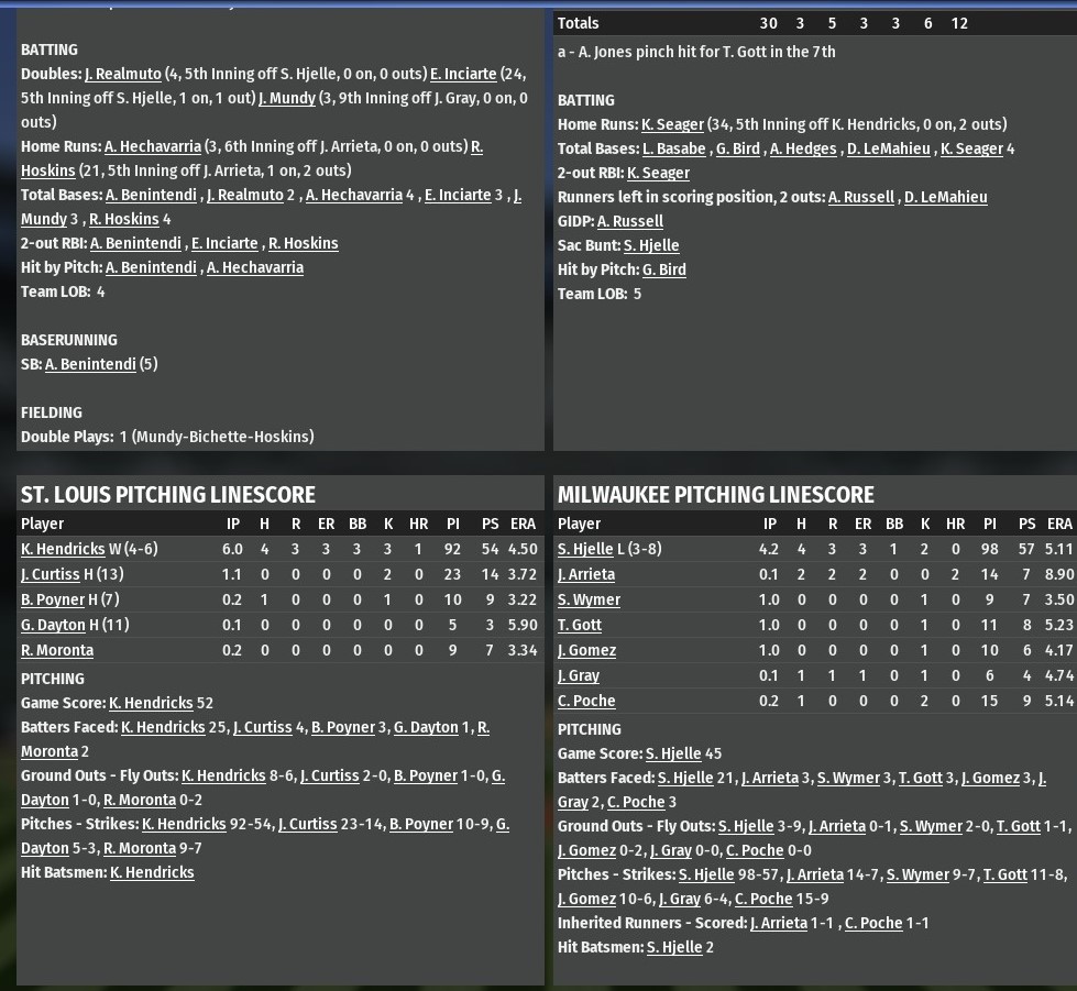 Down 2-0, St. Louis scored four times in the top of the fifth inning and went on for a 6-3 win over Milwaukee at County Stadium (1976). With the win, the River Walkers avoided getting swept in the four-game series. J.T. Realmuto led off the fifth with a double off Keg Lifters starting pitcher Sean Hijelle. A one-out double from Ender Inciarte scored Realmuto. Andrew Benenteidi then tied it with a two-out double. Rhys Hoskins landed the big blow of the outburst with a two-run homer off Hijelle. Its lead trimmed to 4-3 after Kyle Seager hit a solo homer off Walkers starting pitcher Kyle Hendricks in the bottom of the fifth. St. Louis got that run back in the sixth on a home from Adeiny Hechavarria. The Walkers linked on an insurance run in the ninth on an Inciarte run-scoring single off Colin Poche. Hendricks earned the win for St. Louis, allowing three runs on four hits in six innings. John Curtiss pitched a scoreless seventh inning and got the first out of the eighth. Bobby Poyner handled the final two outs of that inning. The ninth belonged to Grant Dayton and Reyes Moronta, who got one and two outs, respectively. |