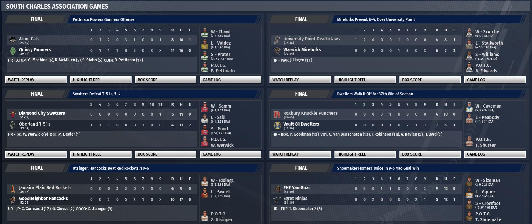 Today in the CBO News and Notes - Reports from around the Commonwealth by Nat Wright-Kawolski 18 July 2299 - Fusion Now 11-4 After Subduing Cats Tim Fusion never let the Cats get in a groove. The left-hander used his bread and butter, his changeup, to pitch the Swatters to a win, 4-0. With the win, Diamond City raised its record to 52-22. Fusion tossed 116 pitches over 8.1 innings to clinch the win for the Swatters. The left-hander allowed just 3 hits, while racking up 9 strikeouts in the game. Fusion said his team "played with determination." Sensation Oren Gep was 3 for 4 with a home run (16), a run, and two RBI. Nick Minnier and Tyler Ross also homered. Swatters 2B Danny Suarez had to leave the game in the 1st inning when Jake Doucette of Atom collided with Suarez and poked him in the eye. Mike Grognak finished the game at 2B. 18 July 2299 - Silver Shroud Prevail, 7-5, Over Finch Farm The Fort Hagen Silver Shroud picked up a win at Hubris Comics Park, knocking off the Finch Farm Four Leafs, 7-5. Starting pitcher Mike Cartrette was a big reason why. In 6.2 innings, Cartrette surrendered 2 hits, while striking out 14 and walking 2. He allowed 2 runs. Curtis Thriceshot was credited with the save. He has now successfully converted 22 of 25 save opportunities. In the bottom of the first, Andrew Nuka hit a 3-run home run. The 17th home run of the season for the Fort Hagen left fielder put the Silver Shroud on top, 3-0. "You know, at the end of the day, it's about who scores the most runs," said Fort Hagen manager Mark Andersen. Shroud reliever Bob Kearns had a tough stretch in relief, making a game well in hand close. Kearns allowed three earned runs on three hits with a walk and three strikeouts in 1.0 innings in relief to push his ERA up to 15.26. Matt Demented was able to help the Shroud escape the three-run 8th for Finch Farm before Thriceshot came on to pitch the 9th inning. The North Charles Association Institute League-leading Silver Shroud are 48-26. 18 July 2299 - Nordhagen Beach Wins, 7-6, in Extra Innings The Nordhagen Beach Party Boys beat the Lexington Synths, 7-6, in 10 innings at Slocum's Joe Seaside Stadium. The Party Boys got a fine performance from right fielder Jonathan Angelou, who went 2 for 3 with a home run, a double, and 2 walks, while scoring 3 times. The win belongs to Sia Abber in relief. His record improves to 8-0. Doug Dee El (2-4) took the loss for Lexington. Nordhagen Beach raised its record to 53-21 with the win. The Party Boys procured the win, in large part because of shortstop Ryan Bale. In the bottom of the tenth, he produced the game-winning run-scoring triple. "This place went bonkers at the end," Angelou said. Dustin Mart also contributed to the Boys' success, going 2 for 5 with a home run (13), two runs, and three RBI. Crooked Tostado led the Synths by going 3 for 5 with a team-tying three doubles and four RBI. Mike Pigeonfoot went 3 for 6 with a double, three runs, and an RBI. 18 July 2299 - Gunners Top Oberland, 2-1 Gunners fans were sent into a frenzy with a walk-off win. Oberland wasted a solid 8.1-inning effort from starting pitcher Sheng Kawolski, losing to Quincy, 2-1, at The Stone House. The winner was Quincy reliever Ryan Kazarian, now 4-1. The loser was Sheng Kawolski (11-5). In the bottom of the ninth, Quincy's Bryan Benton led off the inning with a solo home run to tie the game, 1-1. With one out, star Ben Pettinato doubled. Stuart Costantino was the walk-off hero, hitting a dramatic run-scoring single to send the teams home. Costantino attributed the win to "energy and focus on the part of everyone." The win gives Quincy a season record of 40-34, now three games up on University Point for the Minutemen League wildcard spot. The T-51s have now lost three straight, giving them just a one-game lead over Vault 81 for the Railroad League wildcard spot.