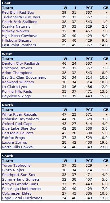 Sunday, June 20, 2010 2010 IPA Mid-Season Recap Tycobbian Union North Division Wide-Open Race In TU North, White River On Top By 3 The Cinderella White River Rascals came out of oblivion and leaped from the cellar to the top of the heap in the Tycobbian North this season. In a wide-open battle, the fast-rising Rascals have a 3-game lead over the Mahaska Haymakers at the halfway point, 4-game edge over the Oxford Red Caps and 5 games better than Blue Lake and Hartsdale, who are tied for fourth. 1st Place - White River Rascals (47-23) Manager - John Randison Team BA - .269 (5th) HR - 84 (5th) Runs - 382 (3rd) Team ERA - 3.60 (11th) Team FA - .971 (20th-tied) Top Pitchers: Mick Cronyn (11-5 2.37) *All-Star Danny Blauser (10-6 3.80) Mark Morse (9-6 3.96) Lance Logan (3-2 1.61) with 16 saves (rookie closer) *All-Star Top Hitters: RF Joey Jarrett (.322/8/39/37) *All-Star LF Bernie Valente (.305/11/43/37) SS Riley Cloy (.249/16/44/46) 2nd Place - Mahaska Haymakers (44-26) Manager - Rusty Tanussa Team BA - .269 (6th) HR - 67 (14th-tied) Runs - 377 (4th) Team ERA - 3.62 (13th) Team FA - .973 (15th-tied) Top Pitchers: Johnny Picou (8-5 2.17) Johnny Spears (7-4 3.15) Don Shaw (10-4 3.91) Dain Abner (8-9 4.13) Top Hitters: 3B Domingo Rios (.326/16/47/55) C Sollie Rees (.277/9/43/41) 2B Walt Long (.312/6/37/51) 1B Timmy Binford (.310/5/35/27) RF Reynaldo Quezada (.271/7/42/34) 3rd Place - Oxford Red Caps (43-27) Manager - Campy Roy Team BA - .267 (9th) HR - 72 (11th-tied) Runs - 361 (6th) Team ERA - 3.47 (8th) Team FA - .978 (2nd-tied) Top Pitchers: Emerson Carnell (10-5 2.42) *All-Star Nicky Nicholson (9-7 3.49) Del Anderson (8-5 3.97) Ronnie D'Abo (5-2 2.84) with 10 saves (rookie closer) Top Hitters: 3B Cameron Kamara (.321/12/54/46) *All-Star LF Mac Spencer (.317/12/42/38) *All-Star 1B Eddy Dowler (.306/10/32/45) CF Wayne McDonald (.292/8/42/50) 2B Carl Graeme (.263/8/49/34) 4th Place (tied) - Blue Lake Blue Sox (42-28) Manager - Cobb Tyson Team BA - .255 (22nd) HR - 75 (7th) Runs - 348 (9th) Team ERA - 3.50 (9th) Team FA - .975 (6th-tied) Top Pitchers: Justin Eckhardt (12-4 2.73) *All-Star Pete Henry (9-9 2.32) Top Hitters: CF Rick Hilliard (.361/14/41/45) *All-Star 2B Loren Babcock (.305/15/51/53) RF Tad Kirklin (.265/13/40/41) 3B Rob Pollard (.294/4/23/46) LF Vic Gelder (.277/11/41/32) 4th Place (tied) - Hartsdale Hellcats (42-28) Manager - Zim Donner Team BA - .280 (1st) HR - 91 (2nd) Runs - 375 (5th) Team ERA - 3.32 (5th) Team FA - .973 (15th-tied) Top Pitchers: Nico Carnera (8-3 2.57) Matt DeRosa (12-5 3.35) Top Hitters: 1B Tom Brabant (.329/20/56/39) *All-Star 2B Jud Turchin (.325/16/54/48) *All-Star RF Mac Faulkner (.300/7/45/44) CF Woody Crow (.289/7/25/48) 3B Kendry Moulton (.285/14/45/42) LF Rob Welch (.294/8/30/25) 6th Place - Fairfax Frogs (37-33) Manager - Harry Buckley Team BA - .270 (3rd) HR - 70 (13th) Runs - 355 (7th) Team ERA - 3.40 (7th) Team FA - .974 FA (14th-tied) Top Pitchers: Joe Hampton (10-5 3.17) *All-Star Scotty Marshall (7-5 3.63) Wally Tidwell (10-8 3.98) Gino Carmazzo (5-5 2.89) Jimmy Dalton (2-0 1.22) (closer) Top Hitters: RF Dane Wesner (.355/22/69/49) *All-Star 1B Chancey Quibedeaux (.303/5/28/45) CF Eric Brockmann (.296/2/23/35) (rookie) SS Wes Hickox (.272/7/41/45) 7th Place - Luxora Zorros (28-42) Manager - Alejandro Rodrigo Team BA - .246 (28th) HR - 50 (27th) Runs - 292 (29th) Team ERA - 3.72 (16th) Team FA - .973 (15th-tied) Top Pitchers: Elio Laurente (7-9 2.85) Ricardo Topez (2-2 2.89) with 8 saves (closer) Top Hitters: 2B Pablo Santa Cruz (.316/5/29/38) SS Joachin Malagon (.284/1/26/28) 8th Place - North Hills Hawks (24-46) Manager - Hub Carlson Team Batting - .234 (32nd) HR - 37 (31st) Runs - 241 (32nd) Team ERA - 3.65 (14th) Team FA - .970 (22nd-tied) Top Pitchers: Ben Dewberry (8-11 3.33) Ronnie Kerensky (7-10 3.35) Lou Dozier (5-10 3.38) Ken Wright (0-2 2.89) with 12 saves (rookie closer) Top Hitters: 1B Masaichi Okawa (.256/11/39/29) |