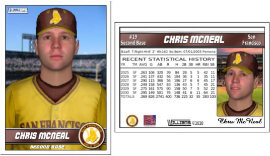 Question about the positions on the regular card: how well do they show with a plain white jersey? Another question: how well does it handle two teams being displayed for one season on the backside? Every player that you've shown so far has only played for one team. Thanks! Great job. Professional looking, even. EDIT: I especially like the copyright date. ![]() EDIT 2: Where'd you get that shadow layer for those jerseys?