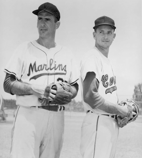 For the two leftys I think the one on the left is Dean Stone. I don't know the other guy. Of the mixed lot I think Bob Duliba is on the right. I don't know the other two. Here is a list of Marlin pitchers that year: Dennis Aust Harold Deitz Bob Duliba Lee Gregory (LH) Bob Grim Bob Milliken Bob Sadowski Willard Schmidt Dean Stone (LH) Bobby Tiefenauer Ray Washburn Hal Woodeshick(LH) Any help is appreciated. |