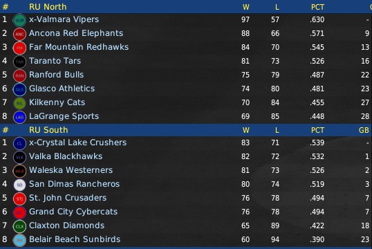 Wednesday, September 1,2027 2027 Ruthlandian Union September Standings Vipers, Bobcats Clinch North And East, 2 Races Tight In South and West Defending Pro Cup champion Valmara and Beechwood are making a return trip to the postseason. The Vipers easily won the RU North and the Bobcats made shambles of the RU East. However in the other two RU divisions four clubs in each are still contending going into the final three weeks of the season. In the RU South the Waleska Westerners and Crystal Lake Crushers are tied for first place, but the San Dimas Rancheros are breathing down their necks, just 2 games back. Fourth place Valka still has hopes, but trail by 5 games. Of the four ball clubs the Crushers are playing the best ball and are given the best chance to win the pennant. Over in the RU West it's a snarling dogfight, too. Middlefield is just barely ahead with a one-game lead over Sligo and Colfax. Fourth place Fort Benton is still contending, only 4 games off the place. It should be a hair-raising finish as all four teams are playing their best ball of the year. August was very good for all of them. The defending division champ Roosters have been through it before and it might give them a slight edge in a very close race. |
