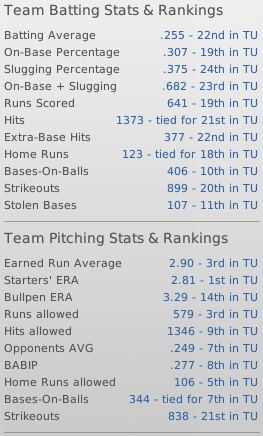 Wednesday, September 22, 2032 2032 Tycobbian East Final Recap Tucks Nip Midway In TU East, Prevail in Playoff From start to finish the Tycobbian West enjoyed a pretty fair pennant race with six teams in the chase... the Tuckanarra Blue Jays nipped the Midway Wolves 7-3 in a single-game playoff for the division flag... Eddie Darby's grand slam in the ninth was the difference. The Tucks took charge in the last two months to edge the Wolves by a single game... the Blue Jays came on strong with a 13-6 record in September and Midway slumped to 7-12, costing them the crown... the Wolves went into the final month 5 games ahead of Tuckanarra... the TU East was one of the few close races this year... last year's winner East Point came in third, missing out by 4 and a half games... fourth in the standings were the Ozarka Naturals, who trailed by 5 and a half... South Fork and Hillsboro deadlocked for the fifth spot, just 6 and a half games out. This was the 7th flag in Tuckanarra's (87-68) history and the 11th postseason appearance... the Blue Jays will be going for their third Pro Cup trophy... they took two in a row back in 2023 and 2024... Carlton "Lefty" Stevens is still running the franchise and would like nothing better than to haul in another Pro Cup... the Tucks boast an impressive mound staff... Matt Stevens (18-10/2.81) and Joel Sheppard (18-15/3.13) won the most games and had help from Philip Marston (13-7/2.06), Glynn Starr (13-8/3.13) and Quinn Starr (11-11/3.07)... Marston was a godsend... he came back in mid-June after missing a year with an injury and posted a super 2.06 ERA, topped only by Gregg Hughes of Hillsboro with a 1.96 ERA, the IPA leader... Stevens doesn't have a heavy-hitting lineup, but they do the job with decent hitters throughout the batting order... the best run producers are 3B Nicky Weill (.294) with 15 homers in 101 games... CF Dusty Rogan (.272) with 24 homers and 74 RBIs... and 1B Lynn Starr (.249) with 11 homers and 62 RBIs... as far as the Pro Cup is concerned, Tuckanarra's experience and quality pitching may take them a long way in the postseason... though defensively the Blue Jays could be better (.970 FA). |
