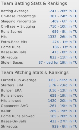 Wednesday, September 22, 2032 2032 Tycobbian East Final Recap Tucks Nip Midway In TU East, Prevail in Playoff From start to finish the Tycobbian West enjoyed a pretty fair pennant race with six teams in the chase... the Tuckanarra Blue Jays nipped the Midway Wolves 7-3 in a single-game playoff for the division flag... Eddie Darby's grand slam in the ninth was the difference. The Tucks took charge in the last two months to edge the Wolves by a single game... the Blue Jays came on strong with a 13-6 record in September and Midway slumped to 7-12, costing them the crown... the Wolves went into the final month 5 games ahead of Tuckanarra... the TU East was one of the few close races this year... last year's winner East Point came in third, missing out by 4 and a half games... fourth in the standings were the Ozarka Naturals, who trailed by 5 and a half... South Fork and Hillsboro deadlocked for the fifth spot, just 6 and a half games out. This was the 7th flag in Tuckanarra's (87-68) history and the 11th postseason appearance... the Blue Jays will be going for their third Pro Cup trophy... they took two in a row back in 2023 and 2024... Carlton "Lefty" Stevens is still running the franchise and would like nothing better than to haul in another Pro Cup... the Tucks boast an impressive mound staff... Matt Stevens (18-10/2.81) and Joel Sheppard (18-15/3.13) won the most games and had help from Philip Marston (13-7/2.06), Glynn Starr (13-8/3.13) and Quinn Starr (11-11/3.07)... Marston was a godsend... he came back in mid-June after missing a year with an injury and posted a super 2.06 ERA, topped only by Gregg Hughes of Hillsboro with a 1.96 ERA, the IPA leader... Stevens doesn't have a heavy-hitting lineup, but they do the job with decent hitters throughout the batting order... the best run producers are 3B Nicky Weill (.294) with 15 homers in 101 games... CF Dusty Rogan (.272) with 24 homers and 74 RBIs... and 1B Lynn Starr (.249) with 11 homers and 62 RBIs... as far as the Pro Cup is concerned, Tuckanarra's experience and quality pitching may take them a long way in the postseason... though defensively the Blue Jays could be better (.970 FA). |