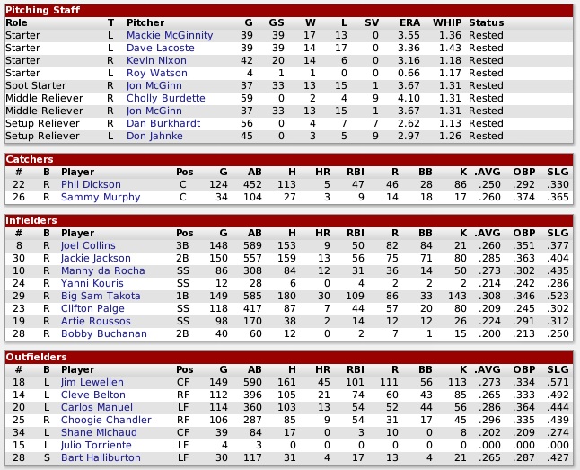 The Mahaska Haymakers (82-72) trailed first-place Fairfax by 13 games and tied for fourth with White River and Oxford... Rusty Tanussa is the only manager in the Haymakers history... he has only 3 pennants and 4 playoff appearances in 31 seasons with no Pro Cups in the Mahaska trophy case... the Haymakers had a good season by being 10 games over .500... Tanussa's team excelled on the mound with a superb 2.83 ERA, which was second to San Alejo's IPA best at 2.73... Mark Pennington (19-10), James Allington (17-15) and Carl Dreux (10-10) all chalked up ERAs under 3.00... but the Haymakers were at the bottom of the league in scoring... SS Buddy Myers (.312), CF Pasha Yablonski (.265), and LF Johnny Yevtushenko (.305) and RF Travis Tuttle (.300) provided most of Mahaska's offense.