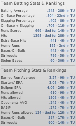 The East Point Panthers (82-72) had basically the same team that won the TU East last year, but the pitching was down a bit... however the talented trio of All-Star Dixie Brooks (19-13/2.21), Jack Bolden (15-8/2.59) and Frank Blair (17-12/3.01) still did their jobs well... it was the bullpen that let manager Karol Zodoka down with a poor 4.06 ERA (26th)... the Panthers didn't hit much for average, but did go deep with 185 homers, second-best in the league... they were just average in scoring runs (14th)... star 2B Tetsu Tanaka led the team's attack with a .302 BA, 34 home runs, 93 RBIs and 96 runs... Tanaka has over 200 homers in his seven seasons... rookie C Jason Charles (.252) made an impact with 20 roundtrippers and 76 RBIs... LF Kenko Aoki (.213) had 23 homers and rookie CF Sean Flynn (.253) added 20 more... the Panthers were just average on defense with a .971 FA.