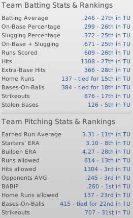 Wednesday, September 22, 2032 2032 Tycobbian West Final Recap RH Reds Roll To 3rd TU West Flag in 4 Years Matty Christianson and his powerful Pro Cup champion Rolling Hills Reds just keep right on rolling along, capturing their 8th Tycobbian West pennant in the last 14 years... the Reds are ready to defend their Pro Cup crown again this season, giving them two in the last three years... they also took the IPA title in 2029. It was a tough task this season as Rolling Hills had to fend off quite a few challengers... they trailed Arlon by 3 games and La Claire by 2 at the All-Star break... at season's end they finally outlasted the La Claire Lynx and the surging Chicopee Braves by 4 games... Bay St. Clair wound up fourth, 7 games off the pace and Arlon faltered to the fifth spot in the TU West and 8 games out after a fine first half. Rolling Hills (83-71) didn't have a great record this season, just like when they won the IPA in 2029... Volusia holds the mark for the poorest record by a Pro Cup champ, when the Vigilantes were 78-72 in 2001, the IPA's first season... the Colfax Blasters with an IPA-record 107 wins in 2010 chalked up the best season mark of any Pro Cup winner... Matty Christianson's club has solid hitting with a .285 BA (2nd), topped the TU in scoring and ranked OK with 120 home runs (20th), his pitching is suspect with a 3.81 team ERA... the starters are decent with a 3.62 (20th), but poor in the bullpen with an awful 4.83 ERA (32nd)... but don't count them out of the running just yet... some analysts like the Reds Pro Cup chances. The Rolling Hills feature some strong sticks like 2B Derek Kristensen with a .343 BA, 73 runs and 44 RBIs... RF Matt Sundberg with a .312 mark and 57 RBIs, 34-year-old rookie SS Freddy Ball with a .311 average and 52 RBIs... and All-Star 3B Billy Christianson with a .311 BA, 13 HRs, 71 RBIs and an IPA-leading 123 runs, along with All-Star C Tony Brinkerhoff with a .280 average, 15 homers and 91 runs batted in... LF Scotty Yiska paced the team with 23 home runs, while batting .288 and driving in 79 runs... Christianson has some experienced starters in Buck Myers (20-6/3.11), Bobby Morris (18-10/3.47), Maury Cantrell (16-14/3.65) and all-time IPA great 38-year-old Errol Gaudet (15-16/3.93), who has registered a sparkling 258-155 record in 14 seasons with a sterling 2.89 lifetime ERA. Last edited by Eugene Church; 07-09-2012 at 08:01 PM. |