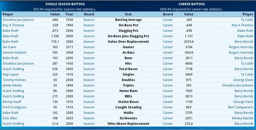 Dynaboyj handled himself with the class and dignity of a gentleman even though I had not. Thank you for that, DB. ------------------------------------------ Babe Ruth sat out the 2011 season. For 2012 he has signed with the Yankees, again. I am attaching the career HR leader board. To have the top 4 place holders the same as in RL is cool. Should Ruth get between 25 and 46 HRs in 2012, the top 4 placeholders will be in the same order ...THAT would be super cool! 3000 hits, 500 HRs, 300 wins, 3000 strikeouts...these are the magic numbers in RL (though this is changing). Here, the magic numbers are 3500 hits, 550 HRs, 350 wins, 3500 strikeouts. All eligible players above these thresholds are in this HOF. The number of players that reached these plateaus here when compared to the corresponding targets IRL is pretty close to the same. ADD: Johnny Mize is listed here as playing until 2006. He did not retire until 2007, so he was not eligible for entry until 2013. Last edited by VanillaGorilla; 12-20-2012 at 03:58 PM. |