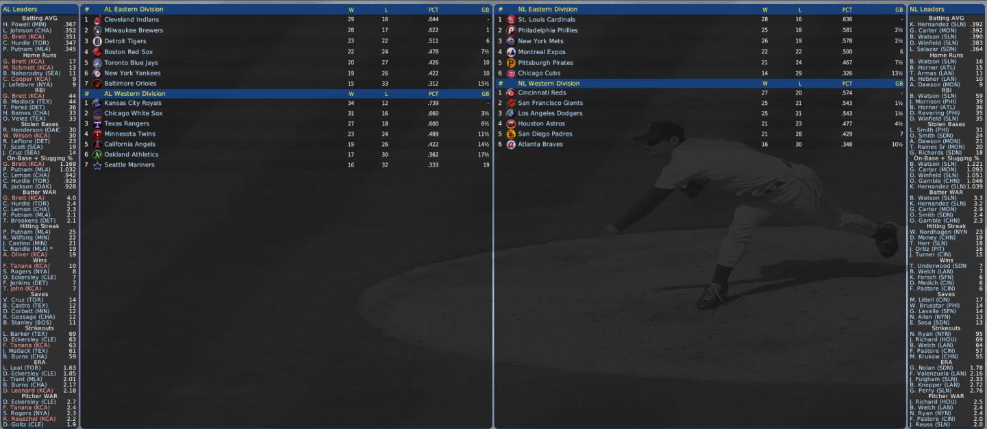 Darrell Jackson (MINN) to miss 12 months Scott Sanderson (MON) out 11 months Lynn McGlothen (Cal) out 9 months, sad twist for the former 4 time 20 game winner Steve Rogers (NYA) with a no hitter over the Tigers A look at this season top prospects http://www.ootpdevelopments.com/boar...1&d=1359410611 |
