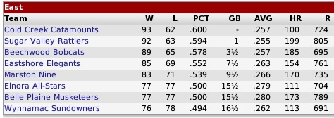 Tuesday, September 23, 2036 CC 'CATS COP RU EAST CROWN, NIP SV RATTLERS IN PLAYOFF It took a sizzling hot July and a single-game playoff before Cold Creek could hoist up its first Ruthlandian East flag in 25 years... after deadlocking in the regular season, the Catamounts triumphed over Sugar Valley 5-1 to decide the tight race... Cold Creek claimed the title by one game over the Rattlers... Sugar Valley had lost out the last two seasons by a scant game... Beechwood came in third in the standings three and a half games back... the fourth spot went to the Eastshore Elegants... Marston, which led at mid-season, faded to fifth place in the second half, winding up nine and a half games behind Cold Creek... Elnora and Belle Plaine tied for sixth place trailing by 15 and a half games... last place went to Wynnamac 16 and a half off the pace... the Sundowners were the only losing team in perhaps the strongest division overall in the IPA... the other seven clubs finished .500 or better. 1st - Cold Creek: Went 23-6 in July to move into contention... had to win last six regular-season games to tie the Rattlers... then won the division in a single-game playoff...last year the 'Cats were third, 7 games out... the last time they qualified for the postseason was way back in 2012... overall in its history this will be Cold Creek's fourth appearance in the Pro Cup playoffs... super pitching brought home the pennant... the Catamounts led the RU with a terrific 3.01 ERA (1st)... they were only average at the plate with a .257 BA (20th) and ranked 14th with 724 runs... Cold Creek was last in homers with 100 (32nd)... they were outstanding on defense with a .977 FA... the Catamounts and St. John are favored to meet in the RU Finals... the Crusaders will have the favorite's role because of better hitting... but don't count out Cold Creek... they probably have the best starting rotation in the IPA. Top Performers: J. J. Gillespie (20-12/1.97), Rob Hutchins (22-11/3.16), Joey Baker (14-8/2.82), George Bailey (14-1/3.35), Lf Shelby Glasscock (.289/11/63/55), CF Guy St. Laurent (.266/17/78/76) 2nd - Sugar Valley: seems to be snake-bitten... lost the pennant by a game the last two years... overall have made the playoffs 10 times, but were never the IPA champ... last appeared in 2029... only hit .255 for average (25th), but topped the league with 199 HRs (1st) and 805 runs (1st)... quality pitching with 3.63 team ERA 98th)... and only average on defense with a .973 FA Top Performers: Josh Wilkerson (23-7/2.83), Jeremy Blanchard (19-15/3.29), Juan Navarro (16-15/3.38), All-Star CF Bobby Gamble (.324/39/119/127), 2B Roger Hobbs (.313/30/130/87), All-Star LF Tyler White (.242/50/133/106), SS Jesse Burns (.283/1/42/98) 3rd - Beechwood: only 3.5 GB... up from sixth in 2035 (20 GB)... hasn't been in the playoff since 2027... no Pro Cups to its credit, just 3 pennants... only batted .257 (22nd), but hits the long ball (185 HR-3rd)... yet has difficulty scoring (695 runs-24th)... very good on the hill with a 3.27 ERA (2nd)... pathetic defense (.969 FA) Top Performers: All-Star Ken Arby (20-12/3.22), Maury Patterson (20-12/3.15), Nick Tarkovsky (17-15/3.13), All-Star SS Cody Hanks (.304/24/92/81), RF Eddie Wilson (.288/33/76/100), CF Howie Baldwin (.257/35/108/96), 2B Leonard Mason (.250/18/58/93) 4th - Eastshore: 7.5 GB... were fifth and 17 games out in 2035... last won pennant in 2034... 2 Pro Cups in 2016 and 2017... 7 postseason appearances... average in the batter's box with a .263 BA (16th), but scored well with 761 runs (8th)... had 154 HRs (13th-tied)... average pitching with a 3.72 ERA (13th)... tough defense with .978 FA Top Performers: Ramon Contreras (21-13/3.11), All-Star Don Klingenberg (17-13/3.18), CF Scotty Lagrange (.299/32/97/93), SS Johnny Petrak (.306/17/77/97), RF Neil Richard (.314/13/72/89), LF Kelly Chamberlain (.267/17/48/85) 5th - Marston: 9.5 GB... came in seventh last year trailing by 27 games... never won Pro Cup... has made postseason 7 times... most recently in 2028... better-than-average batting (.266 BA/15th) and scoring (735 runs -11th) with good power (170 HR-7th)... better-than-average pitching with 3.63 ERA (9th)... just average in the field with a .973 FA Top Performers: All-Star Eldon Franklin (15-12/3.32), All-Star Jimbo McGinnity (7-7/1.02/22 saves), Jack Tunstall (14-4/3.12), 1B Lonnie Trekell (.261/37/91/79), CF Marco Ameche (.293/20/78/78), rookie SS Stan Mila (.296/13/56/58) 6th tied - Elnora: 15.5 GB... won RU East flag last season by a game over Sugar Valley... lost to Tuckanarra in Pro Cup Finals... have made the playoffs on 9 occasions... won 2033 Pro Cup... bats very well with a .279 BA (2nd), but scored only 704 runs (18th) with just 111 HRs (30th)... pitching is solid with a 3.55 team ERA (6th)... impressive .976 FA Top Performers: All-Star Stan Kivas (20-10/3.11), Jeremy Sellers (16-15/3.24), Dan Pitts (16-15/3.27), All-Star 2B Akihiro Samurakami (.336/12/70/63), RF Clint Thomas (.280/20/67/101), SS Pat Kaluza (.263/15/80/73)... C Jan Kobak (.308/6/47/67), CF Clive Kenyon (.309/9/54/62), 3B Danny Bierhoff (.306/15/64/53), LF Pasha Yablonski (.297/2.41/58) 6th tied - Belle Plaine: 15.5 GB... finished last in 2035 (33 GB) and 2034 (22 GB)... only one playoff appearance in 2009... no Pro Cups... strong offense with 789 runs (1st), .280 BA (1st), 173 HRs (6th)... horrific on the hill with a 4.59 ERA (30th)... just fair in the field with a .970 FA Top Performers: All-Star RF Boo Boudreaux (.330/34/93/103), 1B Mitch Mason (.314/29/85/82), 3B Kit Ritter (.318/14/84/75), LF Noel Martin (.265/17/78/90), CF Lonny Wright (.308/16/60/78) 8th - Wynnamac: 16.5 GB... Sundowners were fourth the previous three years, 11 to 17 games behind... won the 2008 Pro Cup... took 5 pennants in all... not a lot of offense, ranks 17th with a .262 BA, but 26th in scoring (691 runs - 26th) and 113 HR (29th)... mediocre on the mound with a 4.06 ERA ((18th)... defensively fairly strong with a .975 FA T