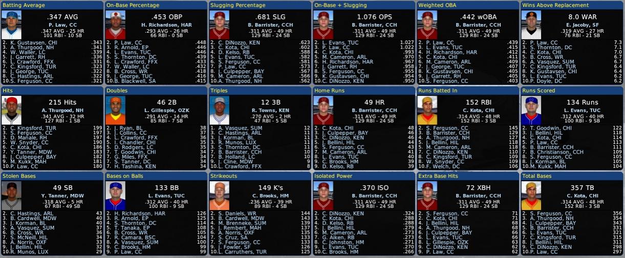 Tuesday, September 23, 2036 SPORTS REIGN IN RU NORTH, 4TH FLAG IN 5 YEARS In the Ruthlandian North it was a battle to the finish line with the LaGrange Sports nipping the Kilkenny Cats by two games... this was the Sports' fourth flag in the last five seasons... playing in one of the weaker divisions in the IPA only LaGrange and Kilkenny had winning records... Glasco was third 8 games back... the preseason favorite Far Mountain faltered badly and came in fourth, trailing by 9 games... the Sports will be the underdog in the Elite 8 opening round against the St. John Crusaders. 1st - LaGrange: four division titles in five seasons... won pennant last year by 7 games... this year by 2... good pitching with a 3.31 team ERA (4th), mediocre hitting with a .255 BA (26th), good power with 161 HRs (12th), pretty good defense (.974 FA)... played in postseason 4 times before... never won Pro Cup... appeared often in recent years (2032, 2033 and 2035). Top Performers: Walt Thurber (20-13/2.62), All-Star Chazz Bassett (20-16/3.09), Nicky Palermo (20-14/3.47), Earl Perkins (2-1/1.10/7 saves), RF Charles Basque (.308/24/85/92), All-Star 3B Claude DesJardins (.287/26/80/69), CF Russell Watkins (.259/20/87/65), SS Fred Bird (.242/4/52/100)... won't be seeded very high in Pro Cup playoffs. 2nd - Kilkenny: lost pennant by 2 this year... closest they have ever come to winning the pennant... Cats were third 8 GB in 2035... never made the playoffs... not much at the plate (24th), pretty fair pitching (7th), strong defense (.978 FA) Top Performers: All-Star Dave Whitaker (23-11/2.01), Ted Flanagan (17-11/4.05), 3B Leevi Viru (.276/24/75/93), LF Kevin McLaglen (.323/15/75/63) 3rd- Glasco: 8 games behind LaGrange... up from sixth last season 24 GB... average on the mound (3.91 ERA/16th), lousy at the plate (.246 BA/32nd), fair on defense (.970 FA)... finished two games under .500... made the playoffs in two of first three seasons... none since 2003 Top Performers: Jimmy Willard (17-14/3.42), Matt Morgan (13-10/3.75), All-Star CF Travis Houston (.265/20/86/80), 1B Johnny Hensley (.271/16/65/94) 4th - Far Mountain: 9 GB... preseason pick, but pitching let them down... finished second last year, 7 games out... last postseason 2025... three Pro Cups 2011, 2012, 2013... better than average batting (.267 BA/14th) and pitching (3.66 ERA/10th), very good defensively (.976 FA)... 4 games under .500 Top Performers: Chad Cummings (17-15/2.25), Jeff Cooper (13-9/4.07), All-Star C Ron Marlowe (.260/28/96/62), LF Harman Silver (.327/17/78/72), CF Wes Wernstedt (.287/4/52/81) 5th - Ancona: 11 GB... rose up from cellar last year 38 GB... 2022 was last playoff appearance... never won Pro Cup in five playoffs appearances... lacks scoring (29th)... poor pitching (4.22 ERA/21st)... average in the field (.973 FA) Top Performers: Steven Russell (17-16/3.29), Buddy Palmer (6-4/1.34/13 saves), SS Tommy Richardson (.349/16/86/76), 3B Alex Zitek (.256/27/82/58), CF Carl Trent (.303/18/66/83), 1B Jesse Clayton (.281/10/75/83) 6th - Taranto: 15 GB... fourth in 2035, 16 games back... in playoffs 4 times total, last in 2019... won one Pro Cup in 2015... hits poorly (.249 BA/30th) but has power with 182 HRs (4th)... average on the hill (3.89 ERA/15th)... average defense (.971 FA) Top Performers: Rio Lobo (13-16/3.64), Rex Perrilloux (14-16/3.72), Don Jahnke (3-1/1.68/5 saves), All-Star C Angelo Rossi (.307/46/120/97), LF Wes Marlowe (.236/40/85/69) 7th - Ranford: 17 games behind... also seventh last year 26 games off the pace... 2034 was last postseason appearance... have made the postseason five times with no Pro Cups... poor offense with .258 BA (19th)... poor pitching corps with 4.33 ERA (25th)... solid defense with .976 FA Top Performers: rookie Ronnie Schroeder (20-13/3.89), Rube Satcher (17-16/3.75), 3B Alex Vanno (.265/23/81/81), 1B Joey Gompers (.252/30/80/62), rookie RF Dale Weston (.302/24/59/53) 8th - Valmara: 25 games back... 23 games out last year in fifth place... 13 times in the playoffs... most recently in 2031... won only Pro Cup in 2026... near the bottom in almost everything... .253 BA (29th), 4.37 ERA (27th) and .971 in fielding average Top Performers: Freddy Pfeffer (15-18/3.65) obtained in a trade with Elnora... 3B Andy Ruffino (.302/11/62/70), RF Benny Hooper (.268/17/82/70) Last edited by Eugene Church; 05-03-2013 at 07:21 PM. |