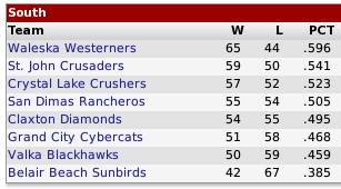 Monday, August 1, 2039 RATTLERS PUT THE BITE ON CATS For the second blistering month in a row the defending division champion of the Ruthlandian East, the Sugar Valley Rattlers, have decimated the opposition with a great 21-8 record... going into July they trailed Cold Creek by two games, not only did they catch the Catamounts they have passed them by a five-game margin... the Rattlers have the top record in the Ruthlandian Union with 70 victories, second to the IPA-leading North Hills Hawks, who have chalked up 72 so far... no one else is in the ballpark in the RU East pennant chase... Beechwood is a very distant third, 15 games back... with Wynnamac and Elnora tied for fourth, 16 games behind... the RU East has settled down to a two-team affair. What makes Sugar Valley so strong is the the vastly-improved pitching... the Rattlers can always score runs, but they always have trouble on the mound... not this year... they are blessed with very good starters: Christopher Dunsberry (13-6/2.78), Juan Navarro (14-6/2.97), Josh Wilkerson (11-6/3.04) and All-Star Jeremy Blanchard (14-6/3.60)... as always, the bats are booming, too, with the likes of superstar All-Star 3B Roger Hobbs (.334/24/87/71), superstar All-Star RF Bobby Gamble (.297/24/82/86), star All-Star LF Tyler White (.278/29/85/69) and 1B Richie Strickland (.288/18/42/96)... Strickland will go over the 100 mark in runs for the fifth consecutive season. The Cold Creek Catamounts slipped to 13-16 for the month and lost their spot atop the division... they still have top-notch pitching with Rob Hutchins (11-5/2.32), Pete Heller (12-5/2.49), Joey Baker (13-7/3.34) and ace J. J. Gillespie (15-8/3.01)... in late May Gillespie was only 4-5 with a 4.83 ERA... since then he has gone 11-3 with an ERA under 1.50... but it's still not enough to hold off Sugar Valley... the Cats just don't seem have the firepower to stave off the Rattlers... their top producers at the plate are CF Guy St. Laurent (.268/17/69/50), SS Jeremy Hall (.293/3/49/69) and RF Ken Brennan (.291/5/48/60)... it appears Cold Creek may have to settle for second place again this season. The Beechwood Bobcats are the only other club in the RU East with a winning record... they are one-game over the .500 mark and were a fine 17-12 in July... the Bobcats hit with power (122 HRs- 7th) and score pretty well (507 runs-8th) and have decent pitching with a 3.72 ERA (17th), especially three of the starters: Neil Palmer (11-8/2.44), John Mueller (10-4/2.54) and Jimmy Herman (13-10/3.27)... top performers at the plate are All-Star SS Cody Hanks (.302/23/82/65), All-Star RF Eddie Wilson (.335/28/75/77) and 2B Mel Smith (.294/12/52/80). The Wynnamac Sundowners had their worst month of the season at 11-18... the offense is still there, but the pitching isn't... they are hitting .273 (3rd), have scored 557 runs (2nd), but don't have much power (85 HRs-26th)... All-Star CF Darrell Donnelly (.335/15/108/73) is having a monster year and is the IPA leader with 108 runs batted in... Donnelly is the only super stick, the rest are good contact hitters, but not much in the way of power... Ernie Hodges (14-9/3.77) is the biggest winner on the staff... not much after him. The Elnora All-Stars are tied with Wynnamac for fourth place... they posted 16 wins and 13 losses in July, but still are 16 games out... possess fairly good offense with All-Star C Cannon Johnson (.316/24/81/64) and CF Clive Kenyon (.333/9/43/57)... however, the pitching is questionable... Jeremy Sellers (13-10/4.22) and Don Martz (10-9/3.95) are the most effective starters. The Eastshore Elegants are in sixth place in the standings... has average bats and mediocre pitching... were 14-15 in July... leading the attack are superstar All-Star CF Scotty Lagrange (.305/20/66/69), star All-Star SS Johnny Petrak (.296/13/50/59), 1B Paul Reed (.306/13/62/50) and 2B Marty O'Reilly (.312/21/55/44)... on the hill Koy Clampett (13-8/3.82) and Ramon Contreras (12-13/3.85) are the most reliable pitchers.... in the bullpen Kenny Chandler (5-4/2.27/12 saves) has stood out. The seventh place Marston Nine did poorly in July at 10-19... just a second-division ball club... Matt Reeves (13-11/3.80) and Barry Sexton (12-13/2.94) are the best starters, while All-Star Webb Walden (4-3/1.88/14 saves) has been strong in the bullpen... All-Star SS Stan Mila (.311/11/67/52) and 2B Lonnie Trekell (.284/15/53/40) are the only reliable hitters. The basement-dwelling Belle Plaine Musketeers began the season well, but went down every month since, spiraling down to a dismal 8-21 last month... to show you how bad the Muskies are, Benny Lucas (8-8/4.53) and Alex Gillespie (10-12/5.15) are the most effective starters... star RF Boo Boudreaux (.282/26/66/64) and LF Noel Martin (.292/21/76/63) are the best bats... with some help from 1B Mitch Mason (.289/18/45/49). Last edited by Eugene Church; 10-04-2013 at 11:05 PM. |