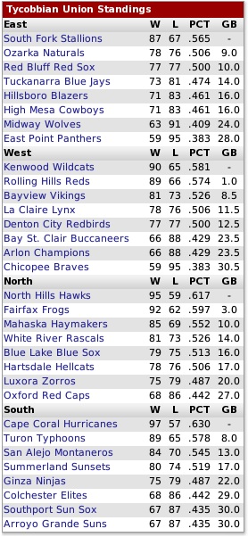 Tuesday, September 17, 2041 STALLIONS RACE BY RED SOX IN LATE SURGE In the Tycobbian East Division the South Fork Stallions and Red Bluff Red Sox ran neck-and-neck until August when the Stallions raced by them to handily win the pennant... the Red Sox faded to third place, losing out by 10 games... defending division champ Ozarka also slipped by them and wound up in second place, nine games behind South Fork. 1. South Fork (87-67): the Stallions snapped a five-year run in the second division of the TU East, all of them under the .500 mark... they pulled up from fifth place last season (6 GB)... the last time South Fork was in the playoffs was the Pro-Cup winning season in 2025... that is their only IPA title... pretty good pitching (3.49 ERA-6th), pretty fair offense (.260 BA-17th) and solid defense (.975 FA) brought home the pennant this year... not expected to be much of a factor in the Pro Cup competition... experts are not impress with pitching, nor batting. Top Pitchers: Jay Murphy (22-8/2.86) and Mike Lambertini (15-11/3.40) gave them two quality pitchers... Big Murph McAlister (12-19/3.37) was effective, too, but didn't have good run support. Top Batters: 1B Paul Sexton (.267/39/109/94) was the club leader in homers, RBIs and runs scored... steady 3B Elton Jacoby (.297/22/82/92) enjoyed another good season... as did SS Jess Wilkerson (.306/18/56/90). 2. Ozarka (78-76) (9 GB): for the fifth time in eight seasons the Naturals finished in the runner-up spot... their downfall was a very poor 4.49 ERA (28th)... they were fine offensively with a .272 BA (6th), 767 runs (6th-tied) and 165 HRs (14th-tied)... defensively the Nats were average with a .974 FA... in 15 playoff appearances Ozarka has never won a Pro Cup, but has come close five times, when they were beaten in the Finals ('11, '12, '16, '19, '20). Top Pitchers: Glen Jenkins (18-14/3.54) was the only effective starter... the best in the bullpen was two rookie relievers Gene White (5-0/2.83/3 saves) and Jim Greene (8-4/3.13/16 saves). Top Batters: All-Star SS Duffy Morrison (.307/25/104/96), LF Lonnie Gillespie (.311/13/73/90), 3B Jimmy Woods (.298/19/88/88), CF Reggie Davidson (.263/29/76/112), All-Star C Jaak Pajukivi (.299/21/74/78). 3. Red Bluff (77-77) (10 GB): the Red Sox rose up from fifth to third this season based mainly on improvement on the hill from 4.38 ERA down to 3.62 ERA (8th) and longball power with 226 HRs (2nd)... only two teams in the IPA had more... Bayview of the TU West led the IPA with 241... number two was Middlefield with 228 in the Ruthlandian Union... the Red Sox haven't participated in the Pro Cup playoffs since 2009, but they did win the Pro Cup in 2004. Top Pitchers: 24-year-old Mickey Rosen (22-8/3.33) came out of nowhere to become the club's ace in his third season... not a lot after him except for George Reynolds (12-24/3.33), who had 20 complete games and 22 quality starts. Top Batters: nobody hit much for average, but they did go deep... All-Star CF Ike Sweetwater (.263) led with 48 homers, 112 RBIs and 114 runs, RF David Kelso (.255) had 44 homers, 102 RBIs and 81 runs... 3B Fran Blanchard (.275) hit 34 HRs with 94 RBIs and 79 runs... SS Leemon O'Donovan (.274) had 29 roundtrippers, 84 RBIs and 69 runs and LF Jesse Shaw (.265) with 23 HRs, 80 RBIs and 84 runs. 4. Tuckanarra (73-81) (14 GB): the Tucks posted their worst season in two decades... they are one of the perennial powers in the IPA with 13 pennants and three Pro Cups ('23, '24, '35)... the Blue Jays had so-so offense with a .255 BA (21st), 688 runs (22nd-tied), 117 HRs (28th) and so-so pitching with a 3.95 ERA (19th)... and average defense with a .971 FA. Top Pitchers: All-Star and ace Junior Bristow (20-13/2.88) racked up 20 wins for the seventh time in his eight seasons... Jeff Buttrum (18-16/4.10) was inconsistent and had a sub-par year. Top Batters: only two had good seasons... LF Spade Weldon hit .356 with 16 HRs, 68 RBIs and 82 runs and superstar RF Lorne Evans rapped 33 homers, drove in 101 runs, scored 96 runs and walked 108 times... Evans, a shoo-in for the IPA Hall of Fame, is 36 years old... he has 660 HRs, 1705 RBIs, 1931 runs and a career .306 BA... Evans is fourth on the all-time IPA home-run leaderboard. 5. Hillsboro (71-83) (16th): for the eighth year in a row the Blazers are stuck in the TU East second division... tied for fifth with High Mesa... they have zilch pennants and no Pro Cups... one of the worst franchises in the IPA... terrible offense but fairly good pitching... .238 BA (30th) with a 3.69 ERA (10th)... really bad defense with a .967 FA. Top Pitchers: starters are credible with Jamie Lee Bradley (14-14/3.02), Lee Dixon (13-18/3.38) and Steve Cooper (14-15/3.97), but got little run support. Top Batters: LF Julien Bellini led the team with 27 HRs, 78 RBIs, 92 runs and 37 SBs, but batted a lowly .226... SS Scotty McNeill had the best average with .295, 7 HRs, 43 RBIs and 86 runs... 3B Paul Butler added a .266 BA with 16 HRs, 77 RBIs and 76 runs. 5. High Mesa (71-83) (16 GB): after almost winning the pennant last year, the Cowboys dropped back tied for fifth... no postseason for 38 years... but they made the playoffs their first two seasons in the IPA and even won the Pro Cup in 2002... nothing but failure since... the Cowpokes have a lousy offense with a .237 BA (31st) and mediocrity on the mound with a 4.17 ERA (23rd)... average with the gloves (.973 FA)... however, High Mesa hits homers... 216 this season, ranking third in the Tycobbian Union and fifth in the IPA. Top Pitchers: Dean Harris (18-12/2.67) and Emil Novak (14-11/3.79) pretty much carry the team... Harris, age 36, has never played for a good team, but has posted a 214-226 record with an impressive 3.03 ERA in 15 seasons. Top Batters: 39-year-old veteran RF Corbett Brooks hit 55 HRs, a career-high, but batted only .238 with 99 RBIs and 94 runs... he now ranks fifth on the all-time home-run list with 651... only HOF-ers Jack Elliott (848), Phil Gra
