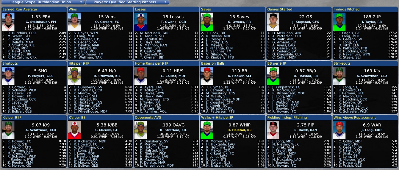 Thursday, August 1, 2047 RUTHLANDIAN UNION JULY RECAP RACE OVER IN RU NORTH, REDHAWKS ROMP There a good race going for second place in the Ruthlandian North, but the pennant race is over - Far Mountain (72-39) has beaten everything in sight and has a 14-game bulge going into the final six weeks of the season. Valmara (58-53), LaGrange (58-53) and Glasco (58-53) are tussling for the number two spot, along with the Kilkenny Cats (55-56). The first place Redhawks have marvelous pitching and scoring, a combination hard-to-beat... they were 18-10 in July... Curt Steinhauer (15-5/1.74), Stan Smith (18-4/3.27) and Jonas Glover (16-8/3.18) have done a great job in the starting rotation, while the bullpen has been solid, headed up by Fernando Sanches (9-6/2.96/13 saves)... at the plate Far Mountain doesn't have any superstar bats with super stats... they do it as a group, but don't hit for high averages except for one parttimer... 1B Rance Hawkins is hitting .368 with 10 HRs, 40 RBIs and 44 runs as a platoon player... the most productive regulars have been CF Todd Purdom (.279/7/36/49), 2B Sammy Prejean (.261/2/37/38), SS Webster Ronstadt (.259/7/45/56) and RF Bert Richter (.245/15/42/51). LaGrange rolled up a strong 18-10 mark for the month... the Sports' top performers are Hot Dog Huxtable (13-8/2.45/4 saves) and Arnie Ayers (15-8/2.63) on the hill and 1B Clayton Justice (.298/20/79/45) and SS Johnny Rodgers (.287/16/79/61) with the bats. Valmara wound up 15-13 in July... veterans stars Primo Sirak (11-7/2.06) and Teddy Twardzik (10-12/2.66) have been great on the mound, but need more run support... the Vipers don't hit with much power and are only average hitters... the club leaders are All-Star SS Ken Jensen (.302/8/53/62), LF Paul McMahon (.316/5/54/29) and 2B Jorge Aparicio (.279/8/38/65). The Glasco A's have excellent pitching and average offense... top twirlers are starters Evan Walsh (13-12/2.41), Benny McDaniel (11-8/2.71), Pat Meyers (13-10/3.04) and Brent Bolivar (9-9/3.35)... the bullpen is strong, too, with Ken McLin (7-6/2.25/9 saves)... LF George Russell (.264/9/61/57) and CF John Rumford (.260/10/44/62) lead the club offensively... the Athletics were 14-14 in July. Fifth place Kilkenny was 15-13 during the last month... the Cats feature good pitching, but have terrible hitting... Dave Stratford (15-12/2.19) has been a terrific starter and is the ace of the staff with some help from Ciaran Cullen (13-12/3.72) and Glen Caswell (12-15/3.00)... SS Sam Norman (.268/17/62/38) and CF Scottie Spencer (.246/13/46/45) are the leaders offensively. RU SOUTH SUPER TIGHT WITH 3-WAY BATTLE There's a tremendous duel going on in the Ruthlandian South. Favored Waleska (60-51) has a one-game edge over Crystal Lake (59-52) and Belair Beach (59-52). The Westerners were 17-11 in July to take over the top spot in the standings, the Crushers 16-12 and the Sunbirds just 14-14... Belair Beach was the division leader at the end of May. The Westerners have the best pitching in the IPA with a 2.76 team ERA, but are less-than-average on the scoreboard... they are sparked by four fine veteran starters in Jeff Woodruff (13-10/2.34), All-Star Niles Nielsen (12-8/2.57), Tony Haskell (13-8/2.89) and Roy Schaefer (12-11/3.15)... the main man in the bullpen has been Vince Gibson (4-5/1.10/11 saves)... SS Pete Hudson (.320/2/39/33) has the top BA... CF Kenny Hardy (.294) is the club leader in hits (132), doubles (27), homers (14), RBIs (62), runs (66) and stolen bases (28)... other contributors are 3B Pete Furness (.266/13/55/37), LF Gene Stevenson (.267/13/39/43) and 1B Rob Rice (.313/11/39/37). The Crystal Lake Crushers hit well for average (.273-1st) and score well (10th), but lack the longball with only 67 (26th tied)... pacing the attack are RF Paul Dillon (.322/8/56/53), CF Jesse Walker (.310/0/23/37), LF Jed Murphee (.289/6/47/72) and C Del Peevy (.281/8/51/50)... the best two starters have been Manuel Hinojosa (8-4/2.59) and Dave McCauley (13-11/3.94)... All-Star closer Josh Crosby (10-5/1.89/14 saves) heads up the reliever corps. Belair Beach's offense is keeping them in the race, but the mound staff could do better... the Sunbirds are 9th in scoring runs, but are 27th with a 3.99 team ERA... carrying the brunt of the attack is superstar All-Star 3B Jason Butler, who is having a banner year with a .320 BA, 33 HRs, 90 RBIs and 72 runs... the 34-year-old Butler is tied for fifth in the IPA in RBIs... 1B Shannon Stewart (.302/10/54/57) and CF Norm Ellis (.268/17/45/47) have also chipped in with the bats... Kevin Tolbert (11-10/3.01) has been the most effective starter, but Ronnie Roy (14-8/4.27) and Jose Munoz (13-12/4.05) have more wins... in the bullpen Tom Cook (4-3/2.47/15 saves) and Ray Dunn (3-1/2.03/6 saves) have stood out. MARSTON ADDS TO LEAD IN RU EAST Six of the teams in the Ruthlandian East have winning records, making it one of the stronger divisions in the the IPA. The Marston Nine (69-42) are making a serious bid to get out of the perpetual doldrums of the second division this year. The first place Nine skied to 20-8 in July and added to its lead, moving six games ahead of preseason choice Sugar Valley (63-48). The powerful Rattlers finished 18-10 for the month. The Eastshore Elegants (60-51) are in the third spot in the standings, trailing by 9 games. They were 16-12 this past month. In fourth place are the Belle Plaine Musketeers (59-52), who posted a strong 18-10 mark, but still fell two more games behind in the pennant race. The Muskies are 10 games off the pace. Marston can swing the bat, ranking near the top in scoring runs (2nd), topped only by Belle Plaine in the RU... the Nine also has topnotch pitching (8th)... the club leaders are All-Star 3B Gary Armitage (.316/17/51/78), SS Stan Mila (.308/15/77/48), RF Charley Gilmore (.310/10/50/46) and All-Star LF D'Wayne Dotson (.289/13/66/70)... on the hill All-Star Felix Delatte (18-4/2.51) is having a banner year... Kelly Long (6-3/1.99/7 save