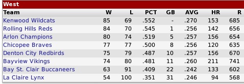 Monday, September 16, 2047 RED SOX WIN 4TH STRAIGHT TU EAST For the fourth year in a row the Red Bluff Red Sox (95-59) hoisted the Tycobbian East pennant over Red Bluff Park. Most of the time they have won it in easy fashion, but not this season. The tough Tuckanarra Blue Jays (92-62) stayed in the race until the final 10 days of the regular season before losing out by three games. High Mesa (86-68) was third in the race, nine games behind. The South Fork Stallions (77-77) finished 18 games back in fourth place. Red Bluff had the third highest win total in the IPA, topped only by Far Mountain with 101 victories and Marston with 96, both in the Ruthlandian Union. The Red Sox coupled fine pitching with super firepower to stave off the Tucks... they led the Tycobbian Union with a 3.07 team ERA (1st), 250 homers (1st) and ranked fifth in runs with 753... the Red Sox lost a seven-game series in the Tycobbian LCS last year to Pro Cup champion Hartsdale... Red Bluff will be among the favorites this year with three strong starters: Jud Cox (22-8/1.76), George Reynolds (20-12/3.08) and Mickey Rosen (19-14/3.10)... in the bullpen Sonny Wheat had 17 saves and an impressive 2.36 ERA, but posted a poor 4-9 record... Cox had the third best ERA in the IPA behind Eastshore's Jody Friday (15-3/1.56) and San Alejo's Matt Bell (22-6/1.71)... in addition the Red Sox boast a plethora of power hitters like superstar All-Star David Kelso (.302/50/109/96), who was fourth in the IPA with 50 homers... only High Mesa's Johnny Tallis (68), Bayview's Jerry Culpepper (60) and Denton City's Wayman Stetson (54) hit more... the other Red Sox sluggers included 3B Fran Blanchard (.262/43/108/94), 1B Josh Stevens (.268/38/83/89), CF Ike Sweetwater (.298/26/80/75) , SS Leemon O'Donovan (.283/19/56/72) and LF Jesse Shaw (.279/18/58/61). Second place Tuckanarra didn't have the power of Red Bluff with only 125 homers (26th), but they did score well (757 runs-4th) and hit well (.272 BA-2nd)... they were solid as a rock on the mound with a 3.25 team ERA (6th)... the starting four were good with Ozzie Leslie (21-10/2.90), Yarran Nawajuk (20-14/3.44), Dickie Pittman (14-12/3.07) and 35-year-old rookie Gary Oliver (11-6/3.24/2 saves)... the bullpen standout was Jack Rogers (13-4/2.26/19 saves)... Rogers tied for fourth in the IPA in saves... All-Star 1B Rodger Parsons had a terrific year with a .347 BA, 34 doubles, 22 HRs, 110 RBIs, 101 runs and 114 walks... only three batters in the IPA posted a better batting average: Kenwood's Country Crowder (.389), Cape Coral's Stan Ferguson (.374) and Middlefield's Johnny McDonald (.351)... Rodgers was the prime offensive threat and led the club in almost everything... he had some help from 3B Niles Tasby (.302/16/72/59), LF Jimmy Markovich (.266/15/56/99) and RF Frank Mason (.278/11/49/77). The High Mesa Cowboys started slowly at 10-18 and fell 10 games back in April... after the poor start they did well, but just couldn't make up that big of a deficit, ending up nine games off the pace in third place... the Cowpokes feature very good pitching with a 3.08 ERA... they don't hit well with a .238 BA (30th), but do pack some punch with 203 HRs (5th)... Lucius Quarles (22-9/2.08) and rookie Lloyd Armstrong (18-12) are top-notch starters... Tee Bo Templet (10-5/3.36/2 saves) was also a quality starter and reliever... closer William Morris (6-5/2.47/15 saves) did a fine job, too... super slugger 1B Johnny Tallis had a year he will never forget... the late-blossoming 34-year-old Tallis (.275 BA) established new IPA records with 68 homers and 178 RBIs... the old record holders were Jerry Culpepper with 66 HRs for Bayview in 2040 and Adam Zitek with 170 RBIs in 2005 for High Mesa... SS Clifford Coleman (.237/38/101/70) and 2B Randy Sweetland (.294/8/59/96) were the only other productive bats. The South Fork Stallions broke even for the season at 77-77... just an average ball club... Jay Murphy (19-10/2.58), Chris Sorensen (19-17/3.55) and Jonas Clay (16-15/3.73) led the staff... the top performers at the plate were rookie sensation CF Jack Boswell (.321/32/85/89), SS Pete Arnold (.303/10/69/97), 1B Paul Sexson (.276/25/64/69) and RF Rick Carlton (.254/18/83/58). The fifth place Hillsboro Blazers had decent pitching, but no offense... Jamie Lee Bradley (17-12/2.84) and Steve Cooper (17-18/2.94) were strong starters, but suffered from no run support... Robby Lee Stillwell (18-18/4.12) also gave the Blazers some quality starts... LF Jurrien Bellini was the offenseive leader... he hit 49 homers, drove in 92 runs and scored 112, but batted only .241... C Harry McGuire pitched in with a .279 BA, 16 homers and 88 RBIs... and 1B Ernie Moxley slammed 25 out of the park, batted in 75 runs, but hit only .234 for average. The Midway Wolves were sixth in the standings... the team's best performers were Charlie Chase (23-12/3.09) on the hill... and at the plate LF Justin Morrison (.340/20/89/88), CF Hector Pena (.291/14/67/106), 1B Jerry Kennison (.257/13/88/62), 2B Rusty Wilson (.293/6/64/82) and RF Alfie Kincade (.252/21/74/72). For the seventh consecutive year the East Point Panthers were mired deep in the second division of the TU East... the Panthers wound up seventh... they don't have much to brag or boast about except for closer Kenneth Lawson (10-3/2.28/5 saves), who had a fine season... Barney Bennett (14-18/4.75) had the most wins in the staff, but the most effective was Ralph Wallace (13-17/3.21)... not much in the way of bats... 1B Jack Gorham (.273/31/71/56) had the most homers with 31... 2B Kelly Walsh (.273/19/69/89) scored the most runs with 89... LF Thomas Woodson (.236/22/74/49) led with 74 RBIs... LF Augie Elizondo (.271/24/60/62) added 25 home runs and C Kenny Bailey (.274/15/46/53) topped the team with a .274 BA. The last place team was the Ozarka Naturals... Billy Hill (12-17/4.07) and Jerald Kidman (12-20/4.09) tied for the most victories on the staff with 12... however the best pitchers were