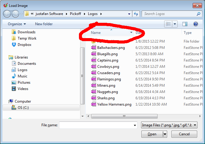Pickoff was suggested by Raidergoo, I liked it and kept it. I can't duplicate this. It's always alphabetical order for me, even if I sort another way with Windows explorer. Unless you mean the "Select Image" dialog. If so, that's controlled by Windows. You can sort the folder from that dialog. Just click on the "More Options" button at the top right (circled in image below) select "Details" then click on the "Name" header to sort by name. Last edited by justafan; 02-26-2015 at 06:01 PM. |