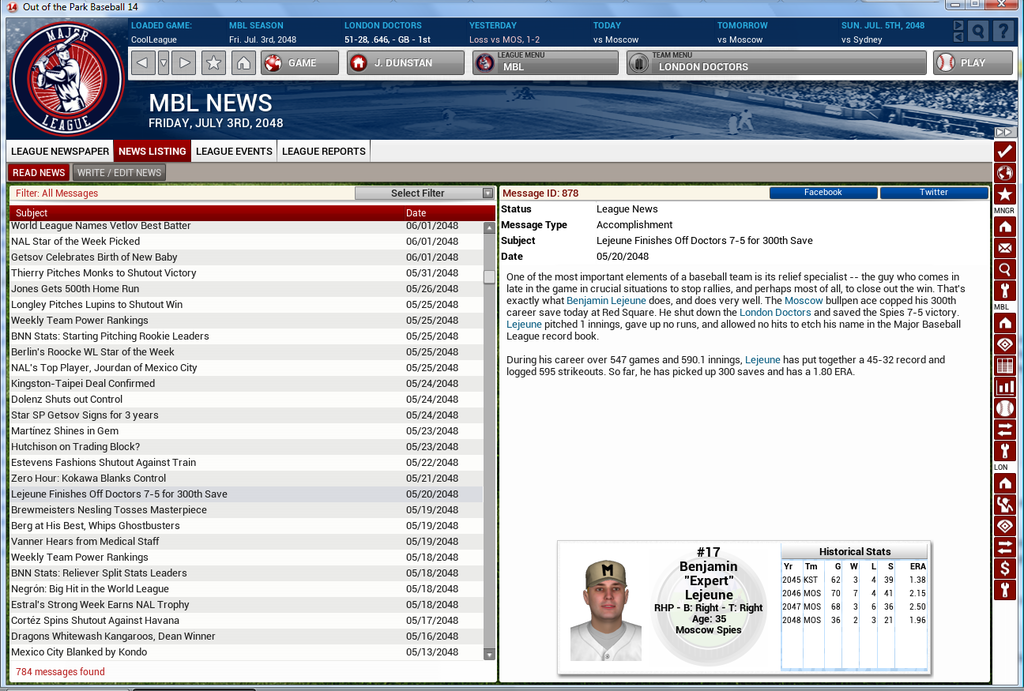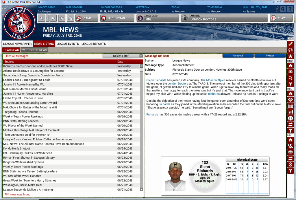 On May 20th, Moscow's closer Benjamin Lejeune got his 300th save against my London Doctors. Nothing all that unusual about that, right? ![]() But then...on July 2nd, Glenn Richards got HIS 300th save. Against my Doctors. His team? Moscow. And to make it even weirder, it was his first save of the season. ![]() There must be some long odds against that, huh? Gotta love OOTP! |