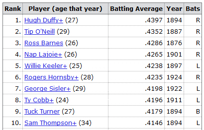 What the hell do I mean by this? (Sometimes I have to ask myself that question. )Well, consider that the result was not .534 or .634 batting average. That would upset me. But .434 is within the realm of human baseball experience, as shown below. Granted, it's not likely to occur in the modern era, but it has occurred and, who knows, could happen again. So, I would treasure this result in my league, on a par with DiMaggio's streak and Ripken's record, and even Williams' .406 which we have never seen again. It becomes fable, legend. Of course, if you are a purist, you may think otherwise. No, .434 is not realistic these days. But could it happen? Yes.