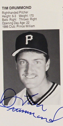 Tim Drummond was a right-handed reliever of the late 1980s. He had 12 saves at AA Prince William in the Pirates chain in 1986 and 10 saves and a 2.97 ERA in the PCL in 1987, so the Pirates gave him 5 major league innings that year (4.50 ERA). Drummond was not really a terribly good prospect, so the Pirates sent him and Mackey Sasser on to the Mets for Randy Milligan. The Mets, in turn, sent him on to the Twins in 1989 as part of the Frank Viola--Rick Aguilera trade. The Twins gave Drummond a couple more cups in 89-90, and then that was it. Drummond made a couple of card sets with the Twins, but I had never seen him with the Pirates until I found a 1987 yearbook for sale online. Here he is.